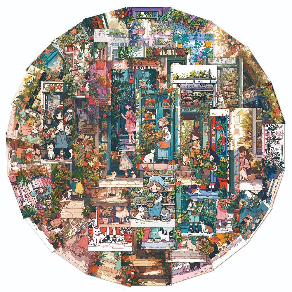 50 little girls and meow stickers OPQ277 in a fresh flower shop