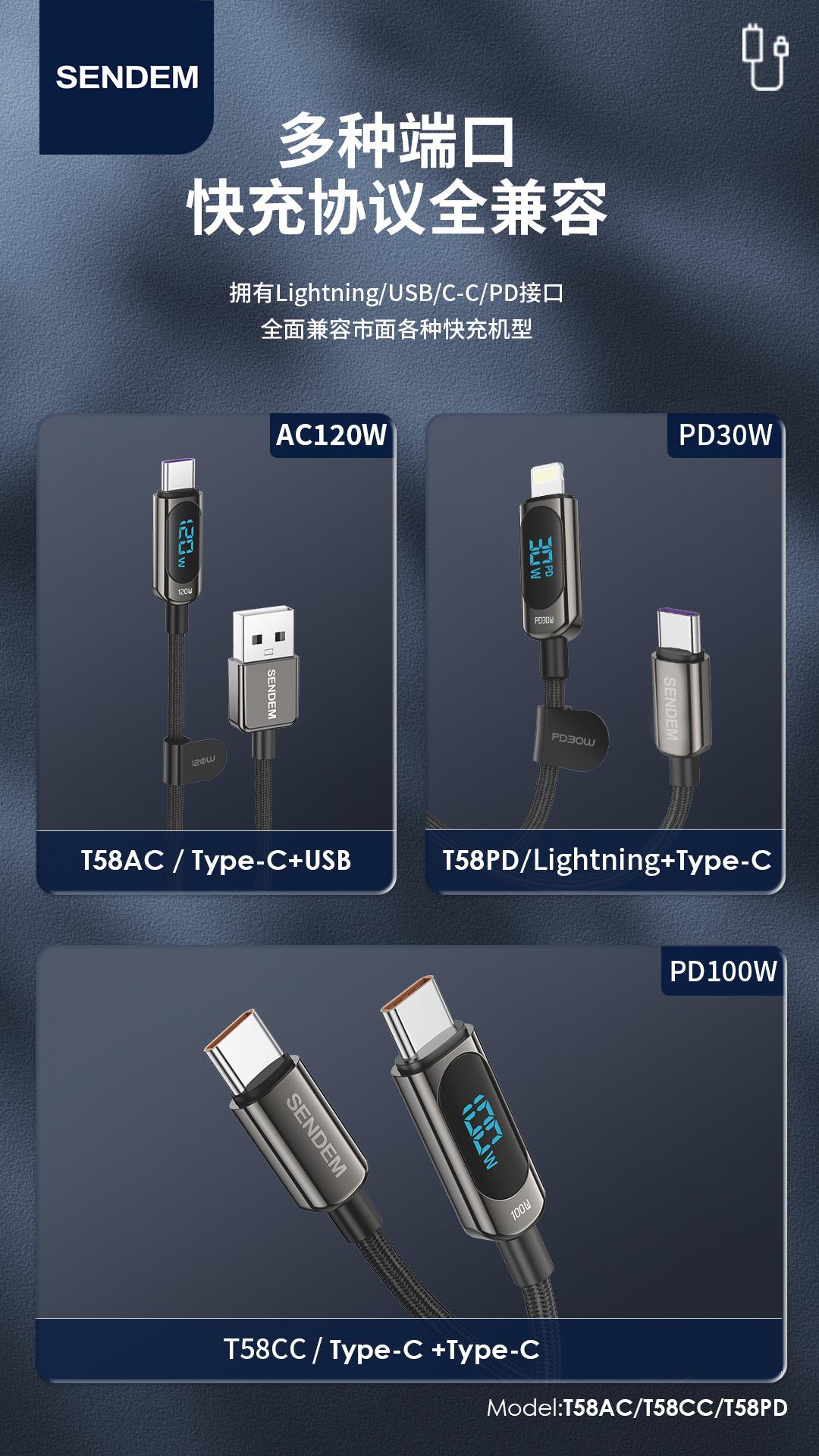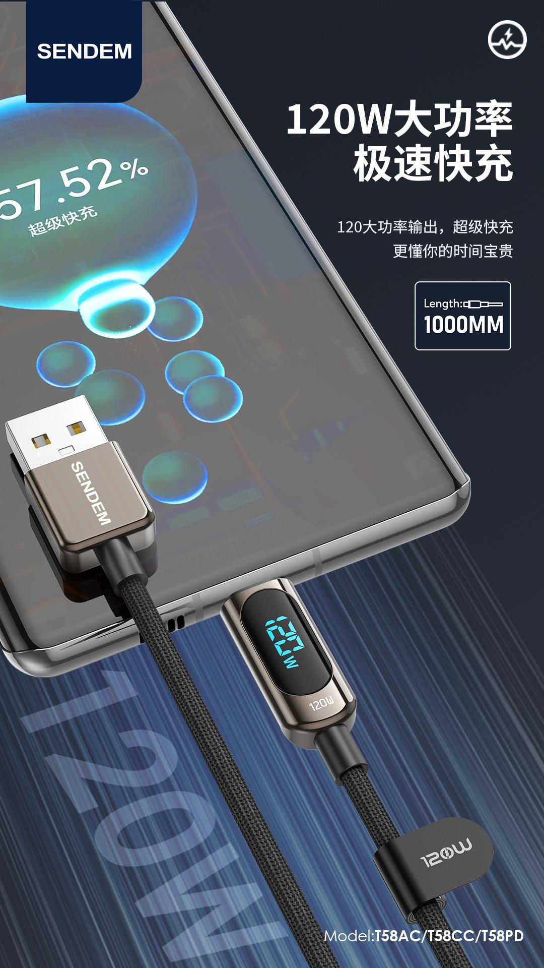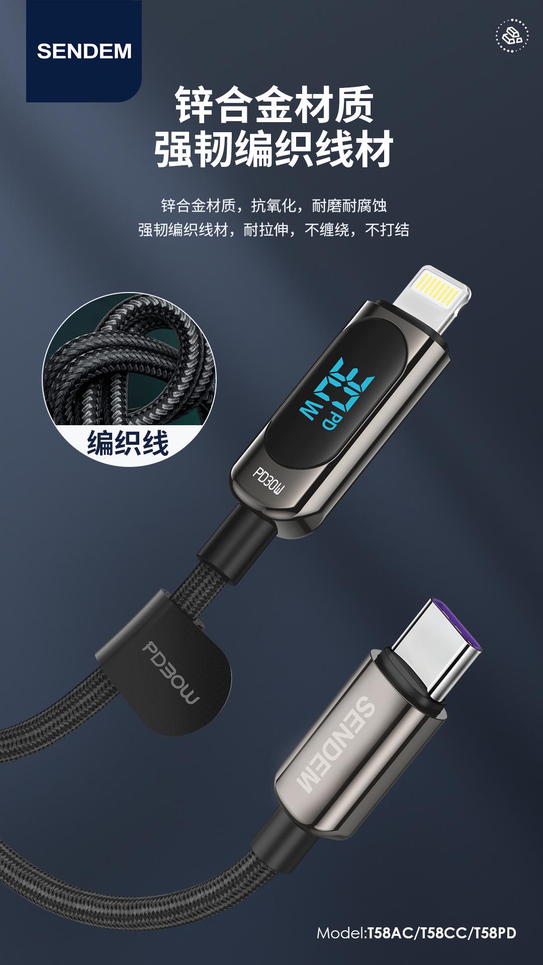 Cable de datos con pantalla digital de aleación de zinc, puede mostrar intuitivamente la potencia de carga, serie T58, línea AC, línea CC, línea C-Lightning. La línea A-C admite carga súper rápida de la serie Huawei Honor, carga súper flash de 100 W de OPPO y carga flash FlashCharge de Vivo. La línea CC es compatible con teléfonos móviles, tabletas, computadoras y múltiples dispositivos con transmisión y carga de alta velocidad de 240 W. La línea C-Lightning admite carga rápida de Apple 8-14. La apariencia está hecha de material UV de aleación de zinc, cuerpo de cable trenzado de nailon de alta tenacidad, duradero y resistente a la flexión.