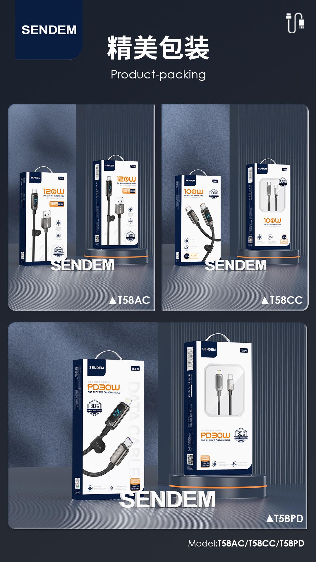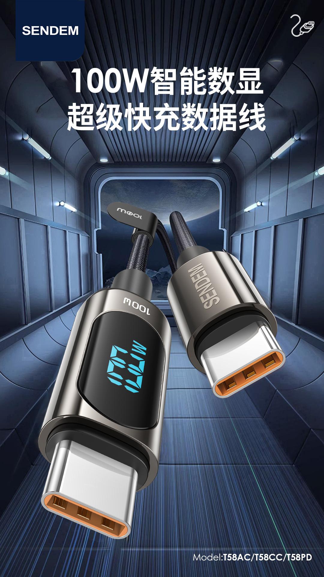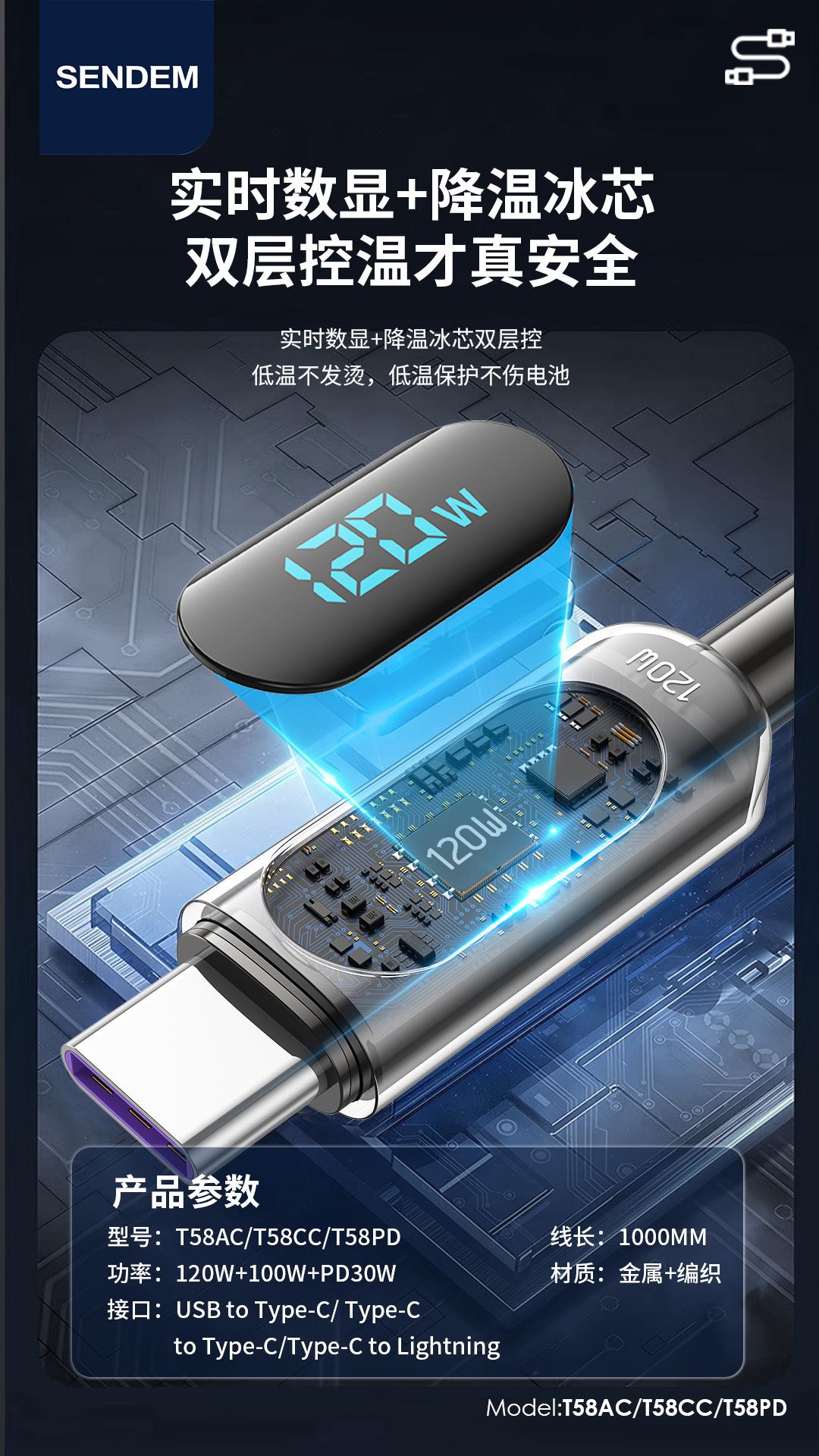 Cable de datos con pantalla digital de aleación de zinc, puede mostrar intuitivamente la potencia de carga, serie T58, línea AC, línea CC, línea C-Lightning. La línea A-C admite carga súper rápida de la serie Huawei Honor, carga súper flash de 100 W de OPPO y carga flash FlashCharge de Vivo. La línea CC es compatible con teléfonos móviles, tabletas, computadoras y múltiples dispositivos con transmisión y carga de alta velocidad de 240 W. La línea C-Lightning admite carga rápida de Apple 8-14. La apariencia está hecha de material UV de aleación de zinc, cuerpo de cable trenzado de nailon de alta tenacidad, duradero y resistente a la flexión.