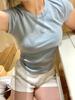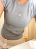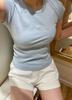 Estilo Bm Nueva Camiseta Azul Dulce de Cuello Redondo con Estampado de Ángel de Manga Corta Ajustada al Cuerpo con Hombro Derecho Descubierto Top Sexy para Mujer