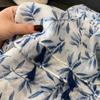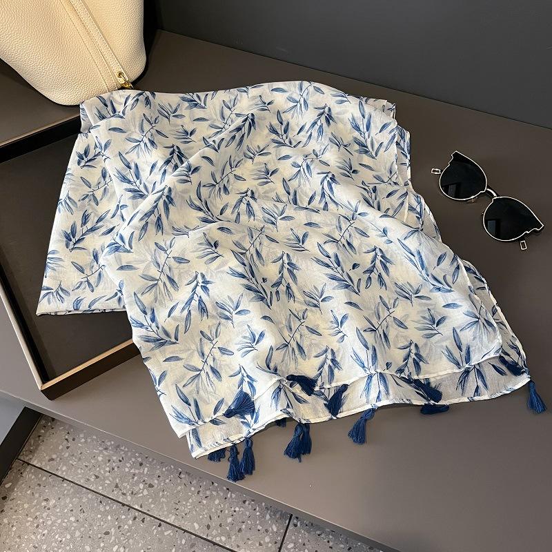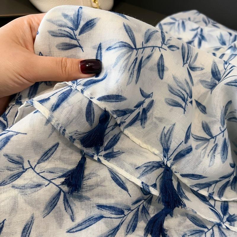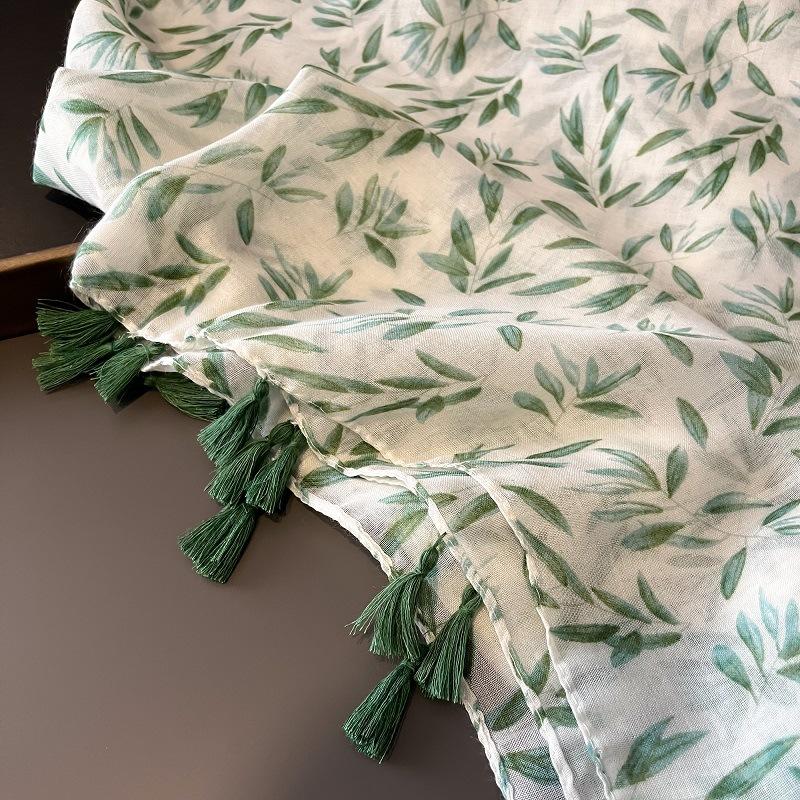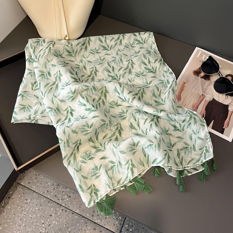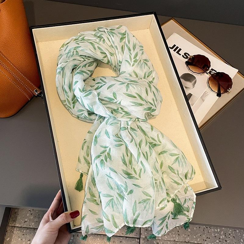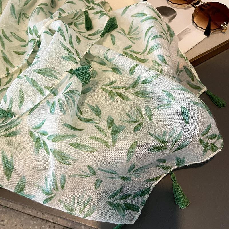 Bufanda de seda con hojas verdes frescas para mujer, chal de protección solar para viajes de primavera y verano, bufanda fina de algodón y lino para otoño