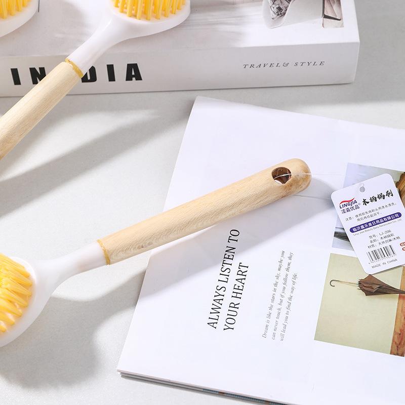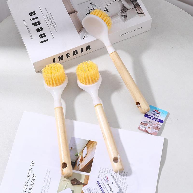 Cepillo de cocina de mango largo para ollas, cepillo de limpieza con mango de madera para lavar platos.