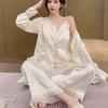 Pijama de mujer de primavera y otoño de algodón y seda con tirantes de manga larga, pantalones de red estilo rojo ins princesa con almohadilla para el pecho, ropa de casa, traje de tres piezas