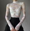 2023 estilo puro sexy encaje costura perspectiva cuello redondo top chica hot slim-fit ligero protección solar manga larga top para mujer