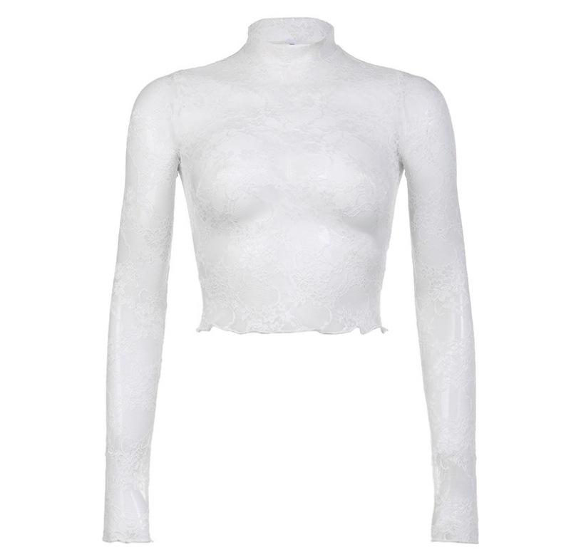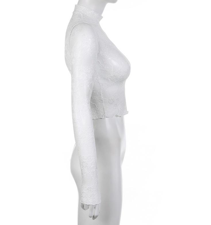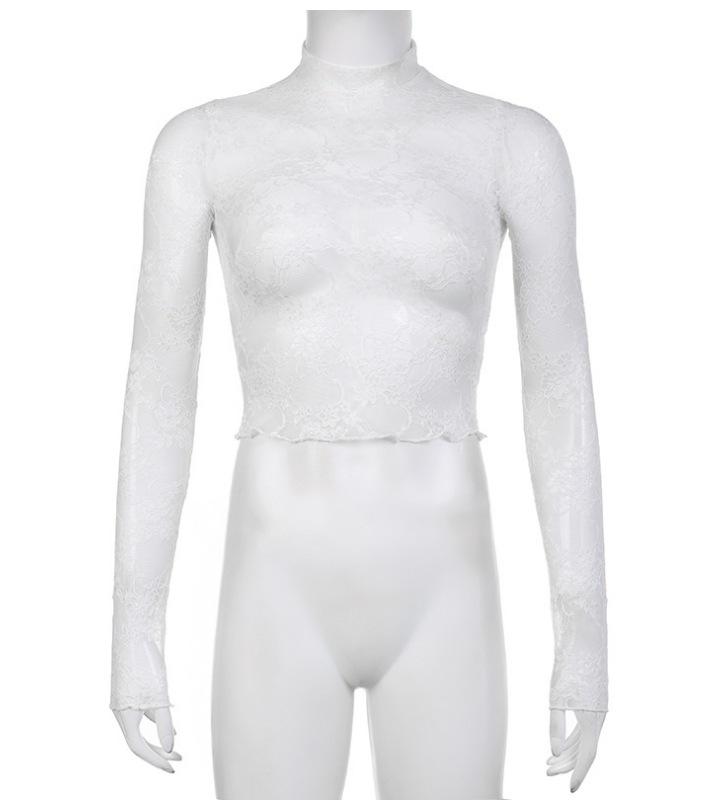 Compra 2023 estilo puro sexy encaje costura perspectiva cuello redondo top chica hot slim-fit ligero protección solar manga larga top para mujer al por mayor en Joom.pro