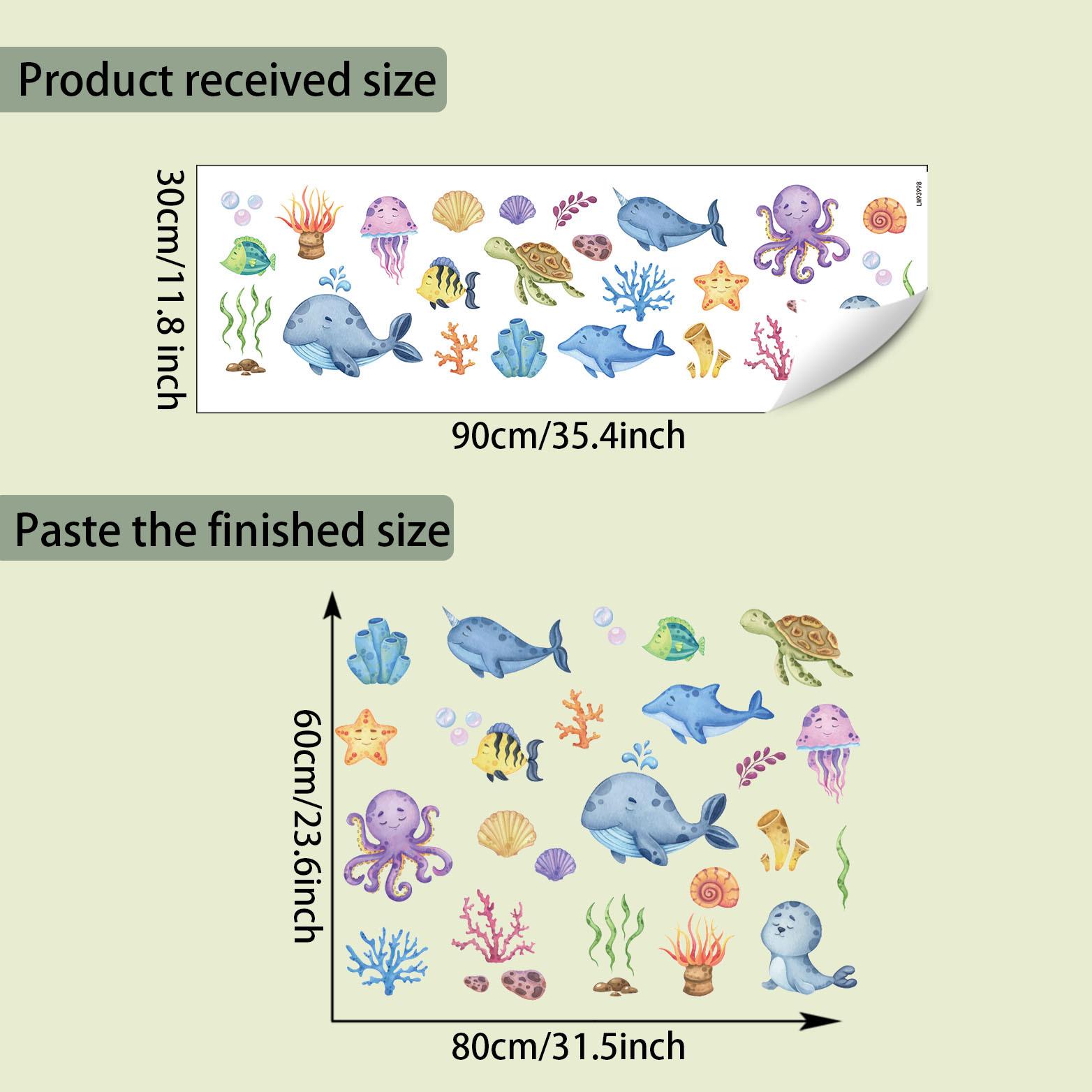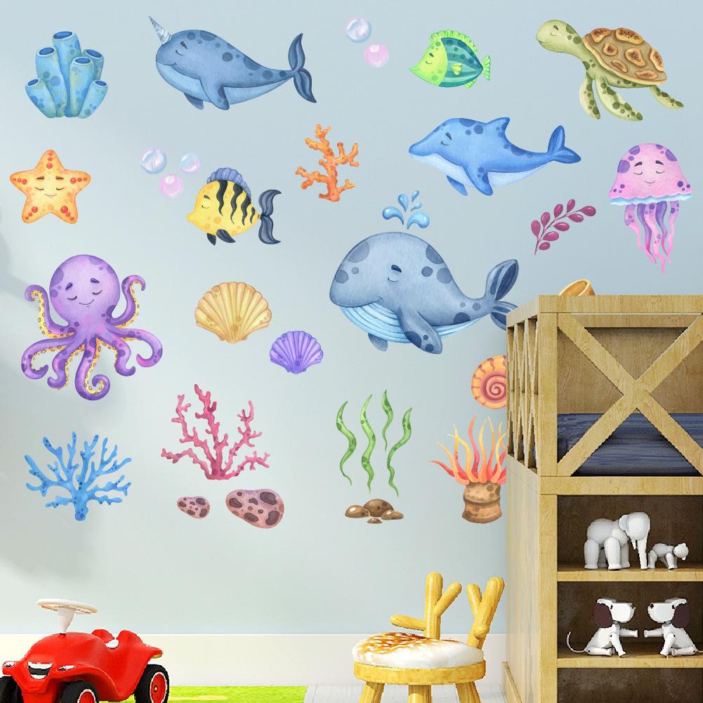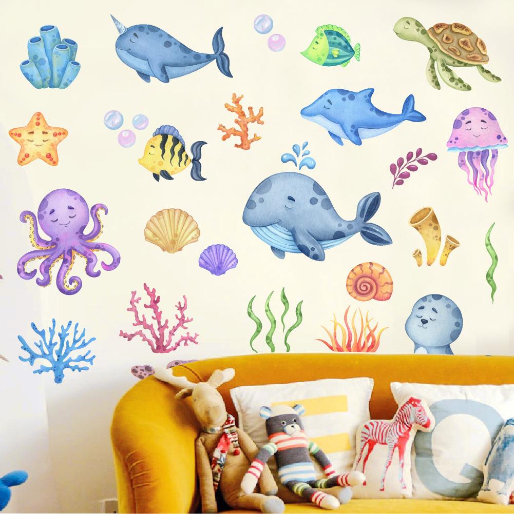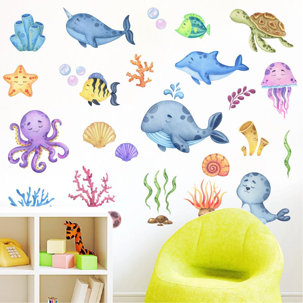 Pegatinas de pared autoadhesivas extraíbles con diseño de ballena, coral, agua y hierba para habitación infantil, baño y hogar.