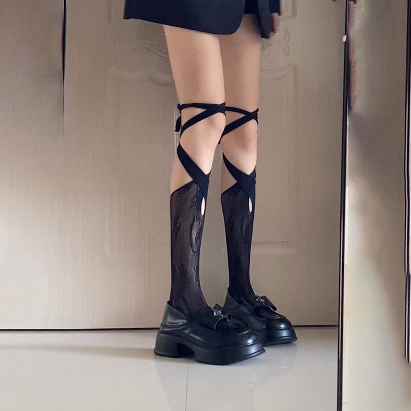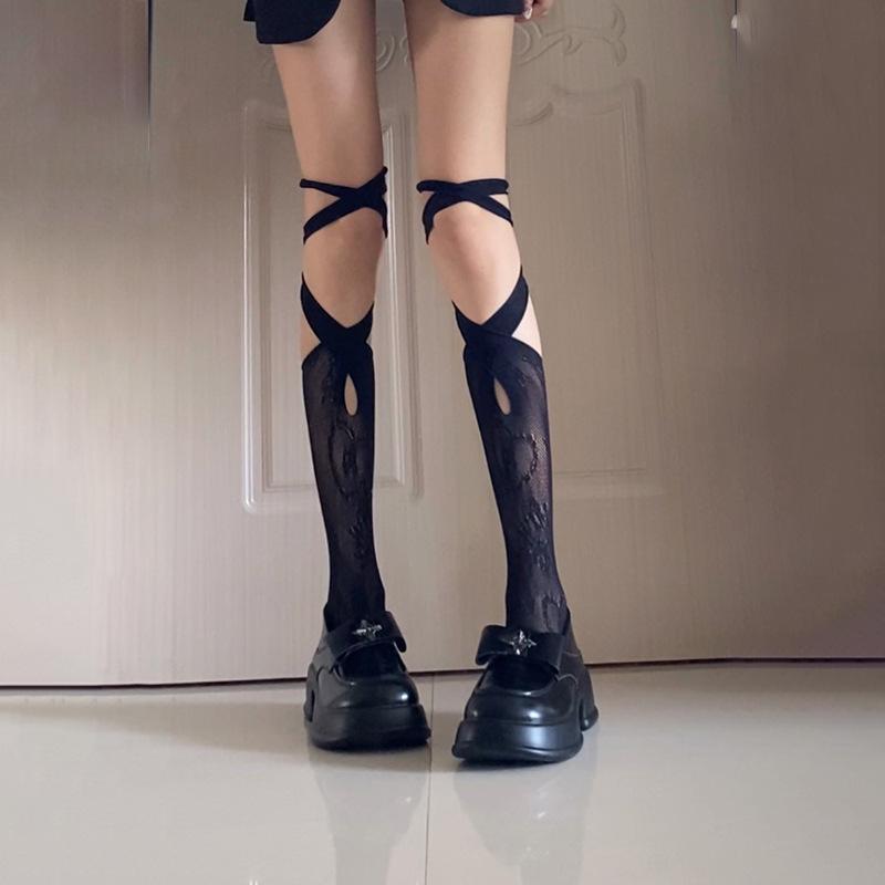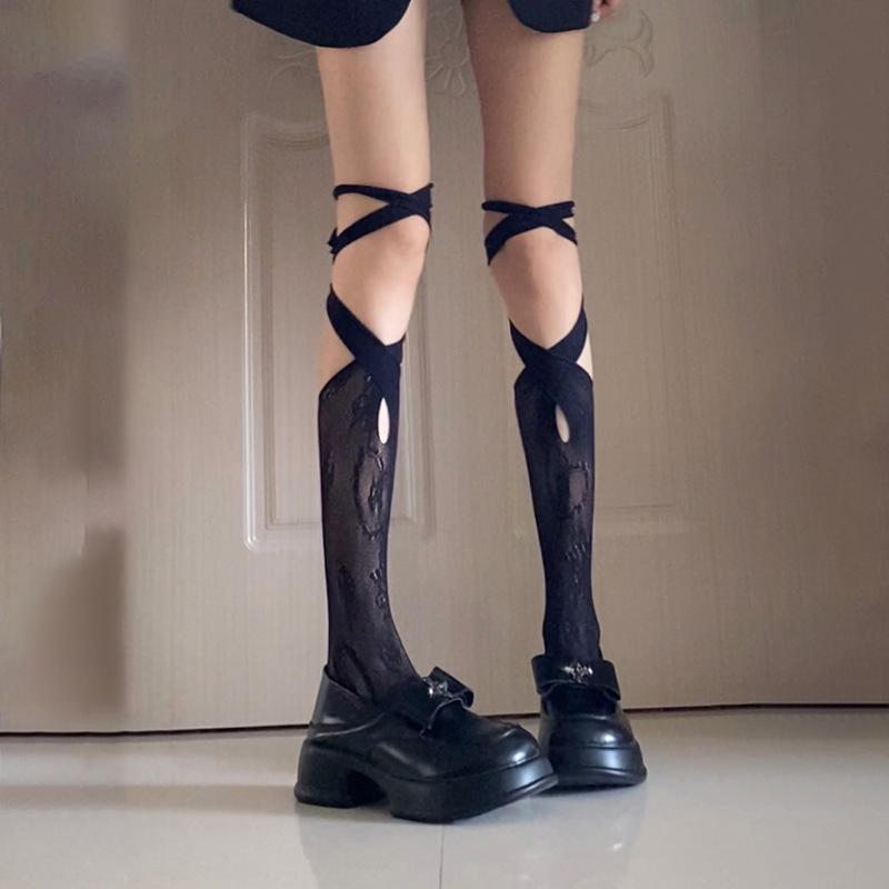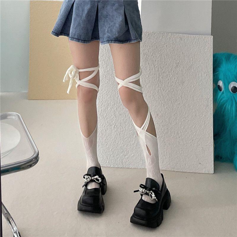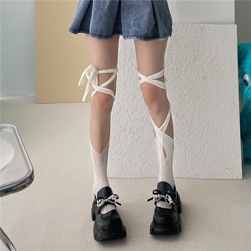 Lace-up long toe socks-milky white, Lace-up long toe socks pure black, Lace-up hollow-out mid-calf length sock...