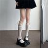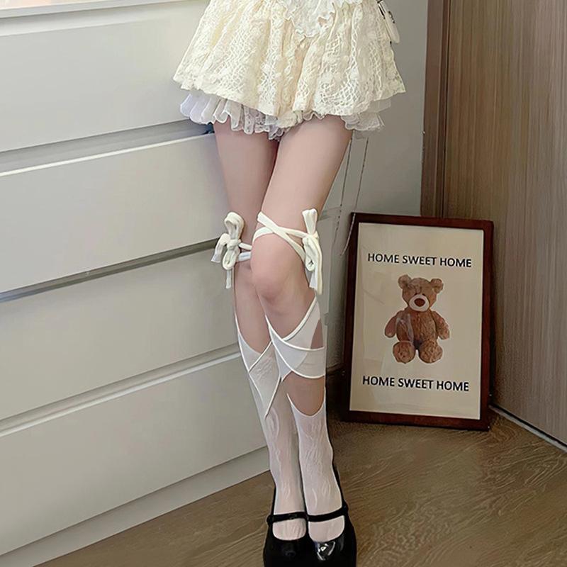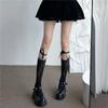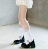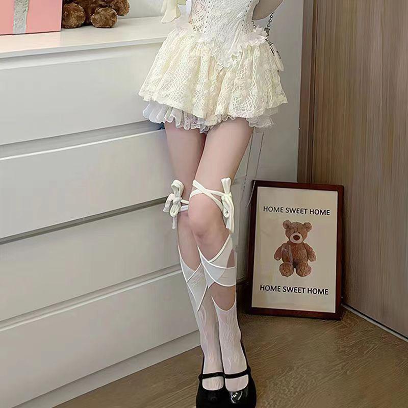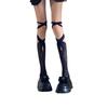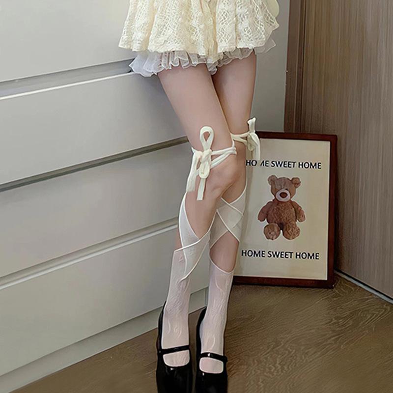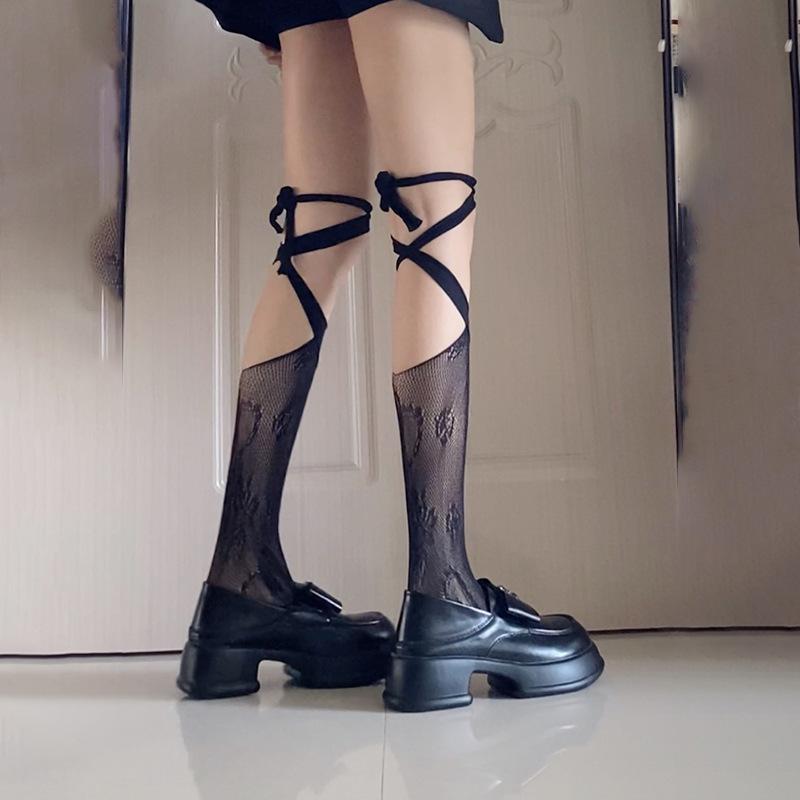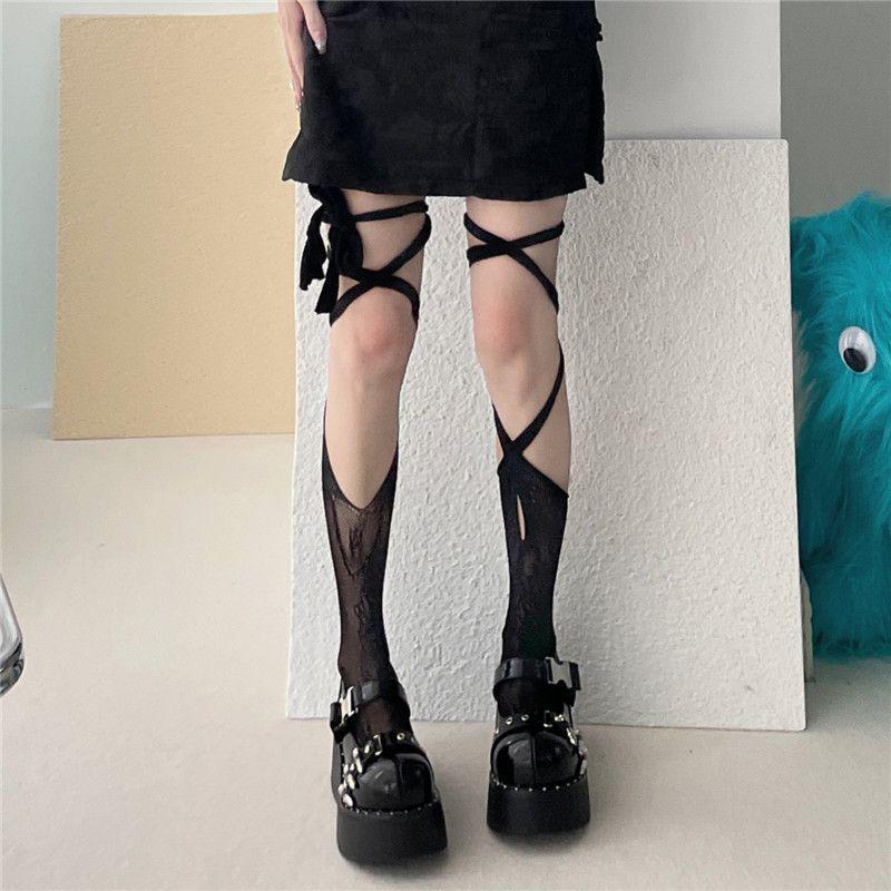 Lace-up long toe socks-milky white, Lace-up long toe socks pure black, Lace-up hollow-out mid-calf length sock...