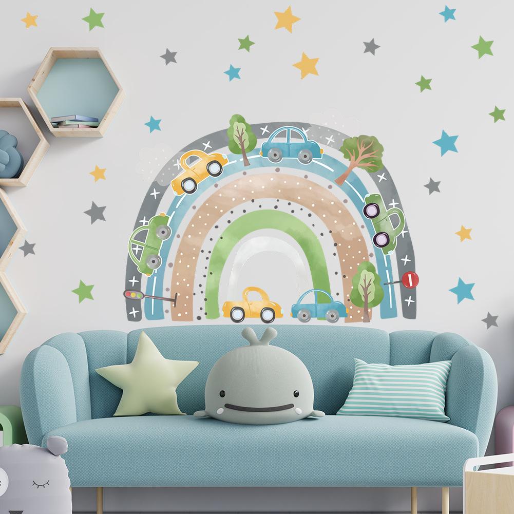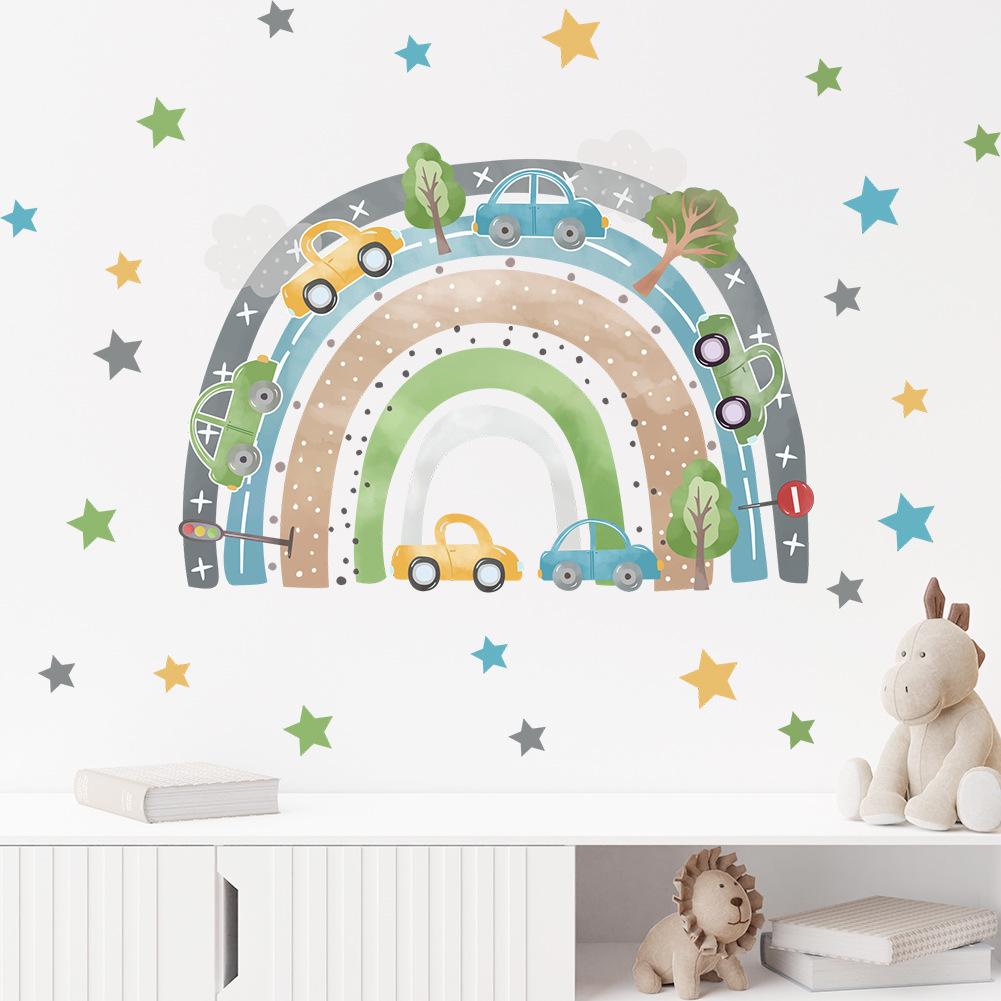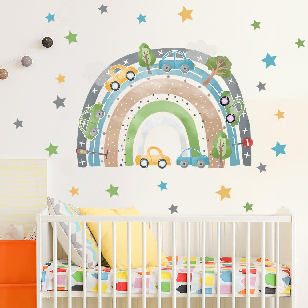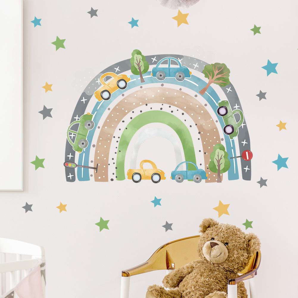 Pegatinas de pared con diseño de coche arcoíris de dibujos animados para habitación infantil, decoración de guardería, papel pintado autoadhesivo extraíble.
