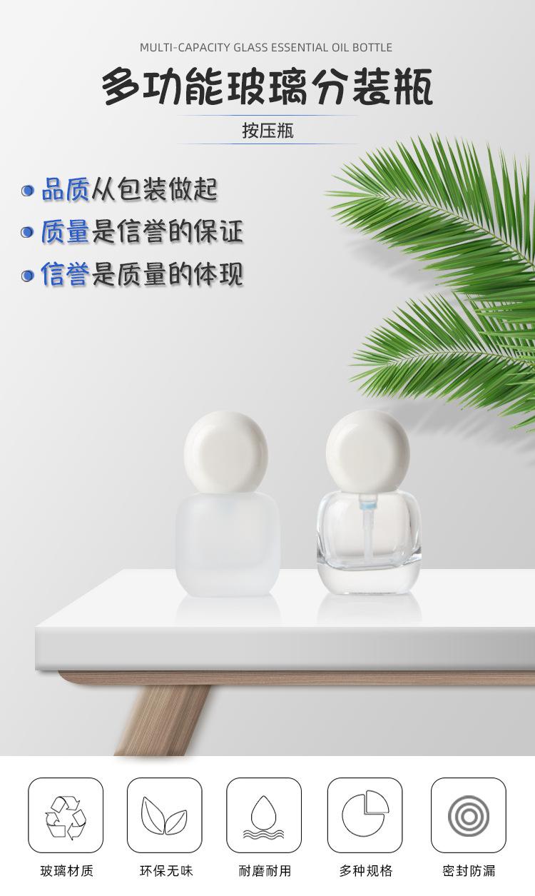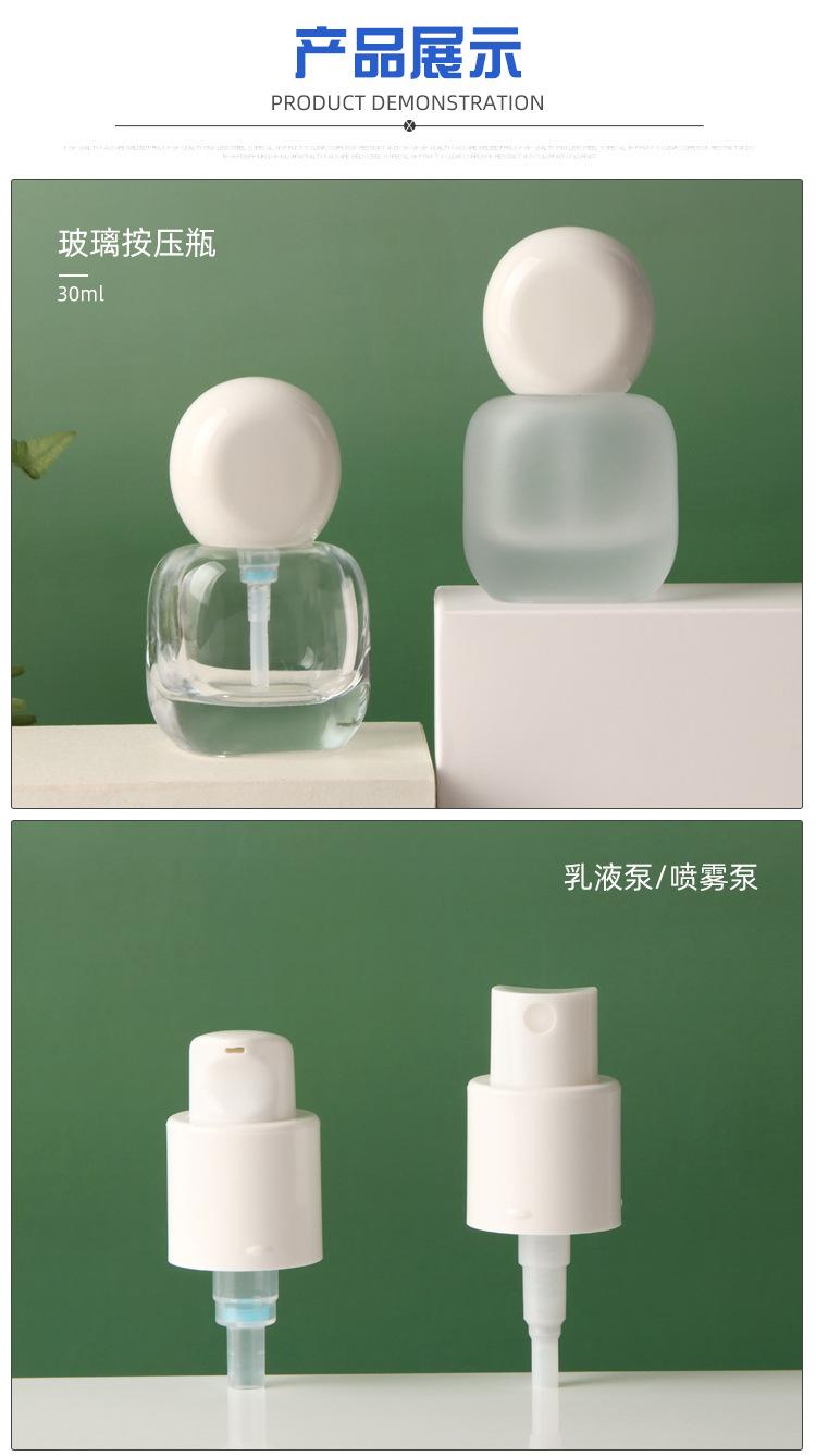 En stock, minibotella de vidrio de 30 ml con pulverizador de prensa, loción de agua, esencia, base líquida, material de embalaje cosmético, botella de fondo grueso