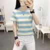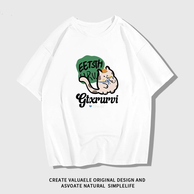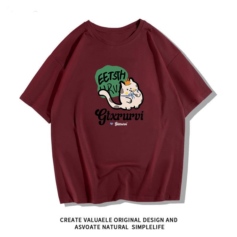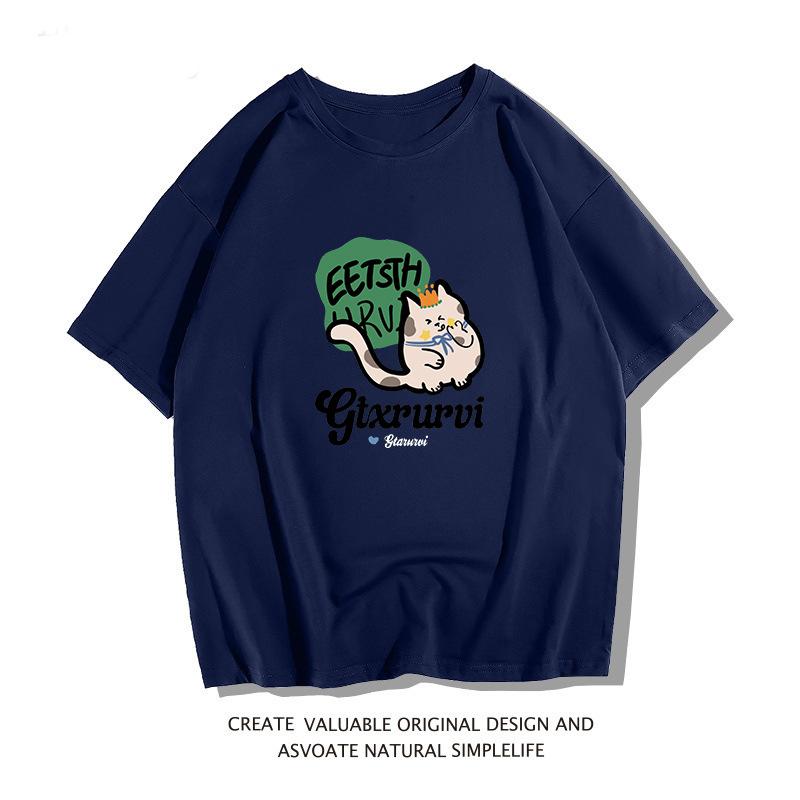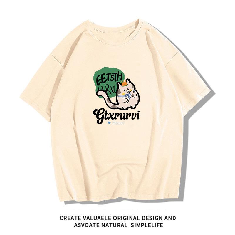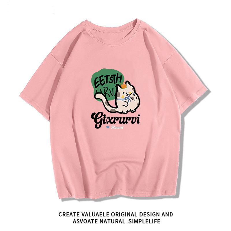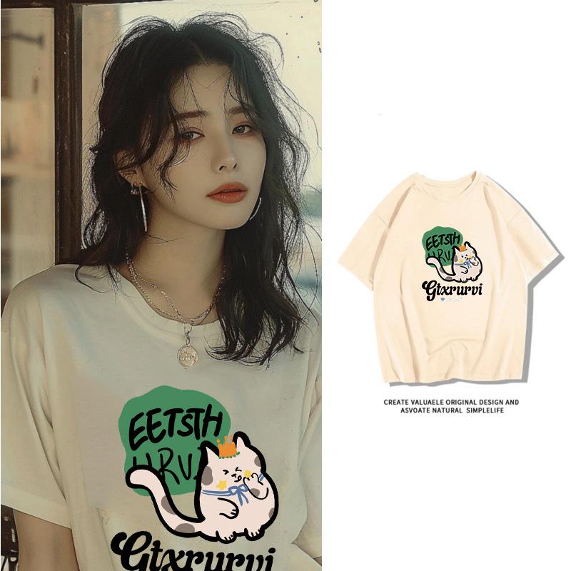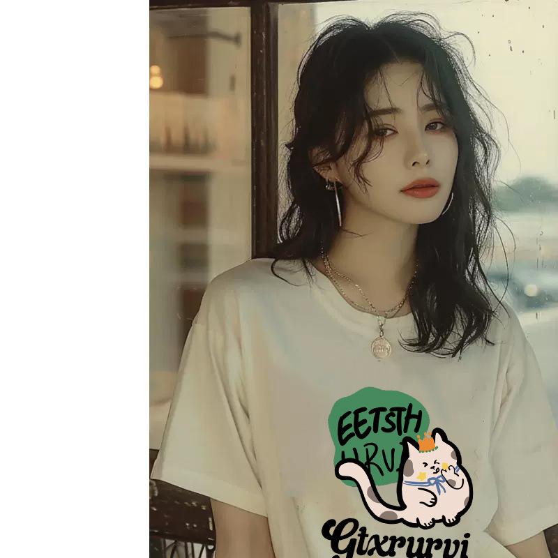 Camiseta de manga corta de algodón peinado para mujer, verano 2024, holgada, estampada, adelgazante, combinable, talla grande, elegante, de moda, top de media manga