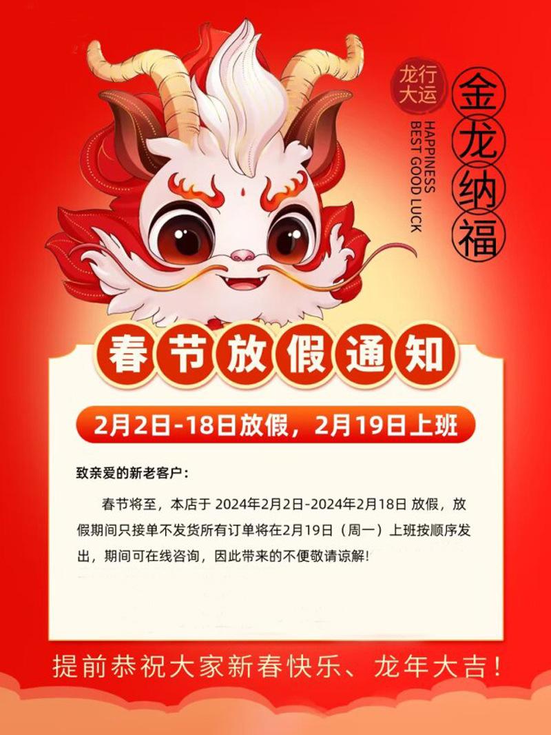 Se acerca el Festival de Primavera. Estaremos de vacaciones del 1 al 18 de febrero. Durante las vacaciones, solo aceptaremos pedidos, pero no haremos envíos. Todos los pedidos se enviarán por orden al regresar al trabajo el 19 de febrero. Disculpen las molestias y les deseamos a todos un feliz Año Nuevo y una familia feliz.