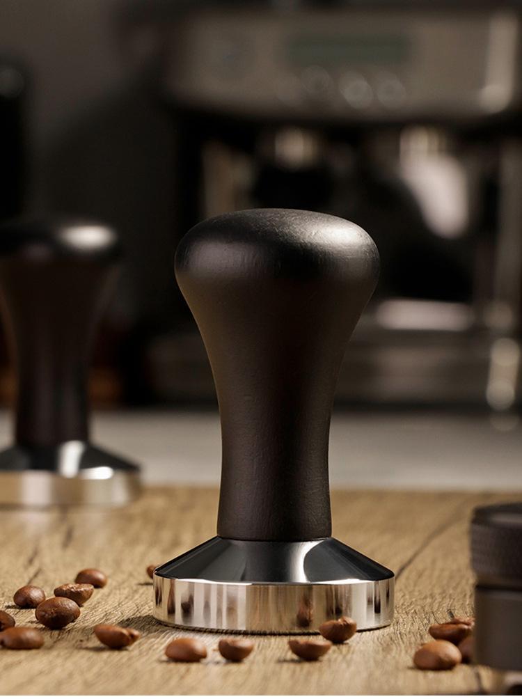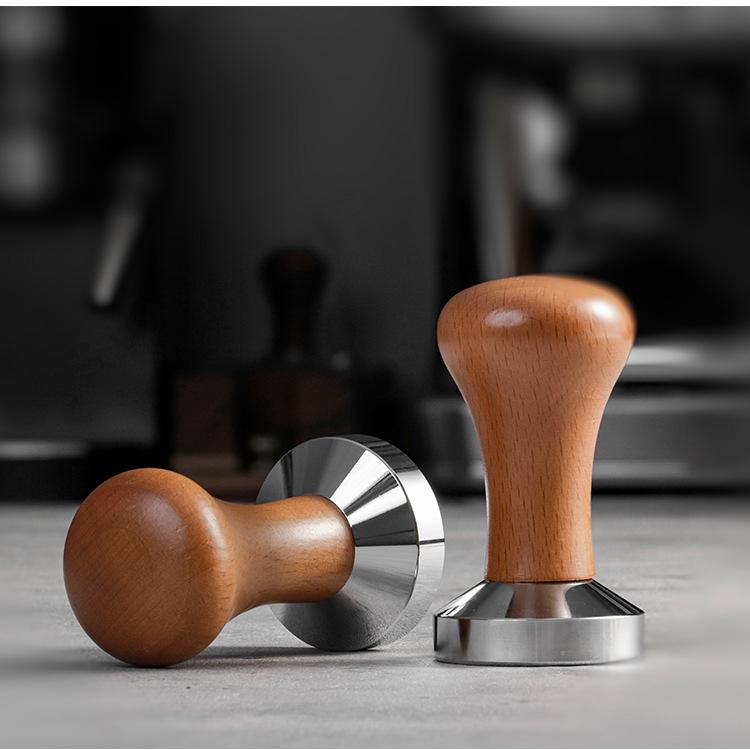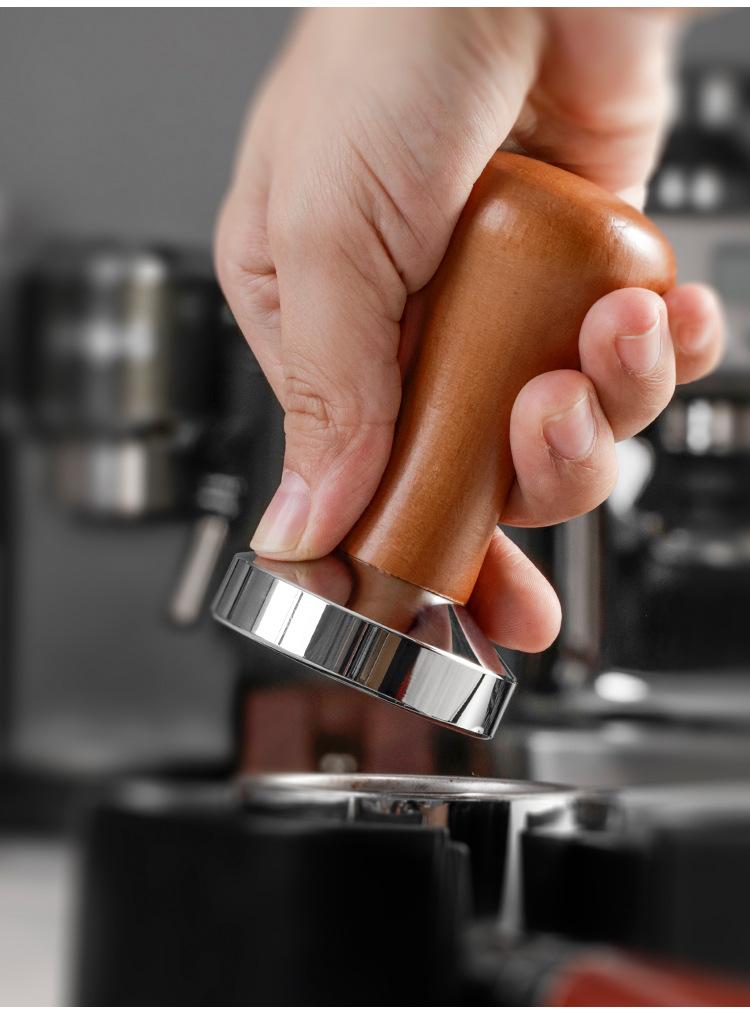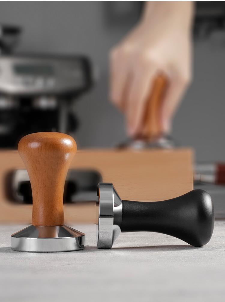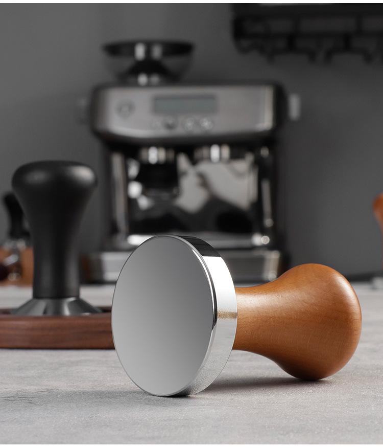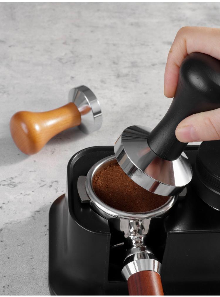 Prensa de café en polvo de acero inoxidable, prensa de café en polvo, martillo de 51 mm, máquina de café con martillo de madera maciza, llenadora a presión sólida de 58 mm con mango de madera
