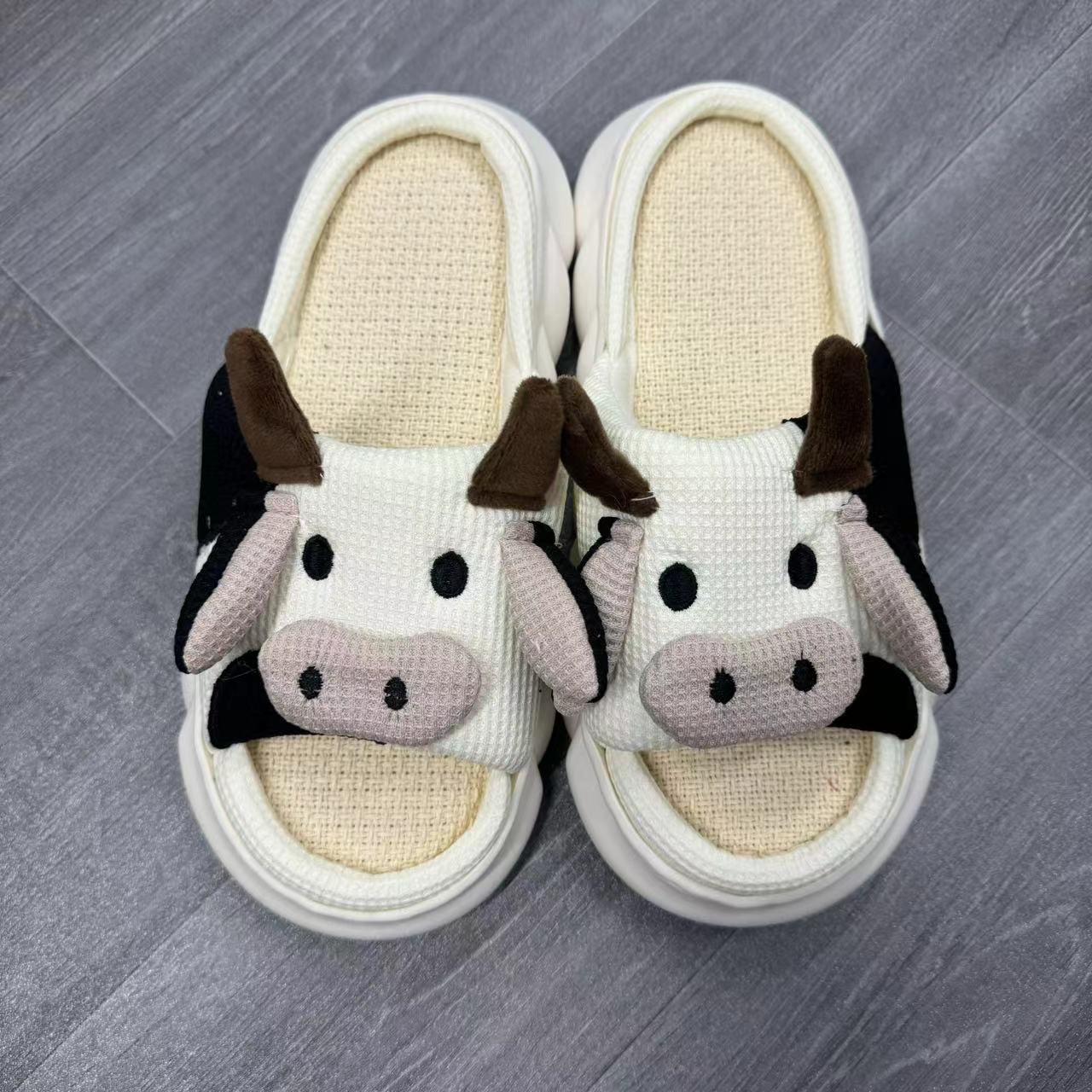 Sandalias universales de algodón y lino para interiores y exteriores, nuevas, para las cuatro estaciones, con lindas zapatillas de lino con diseño de vaca, antideslizantes, 2024
