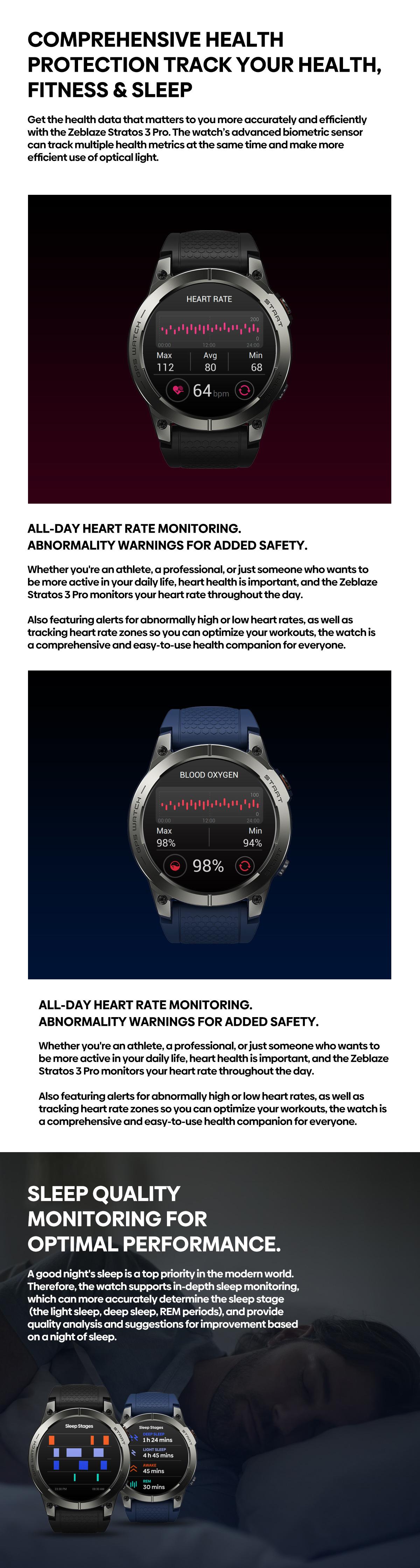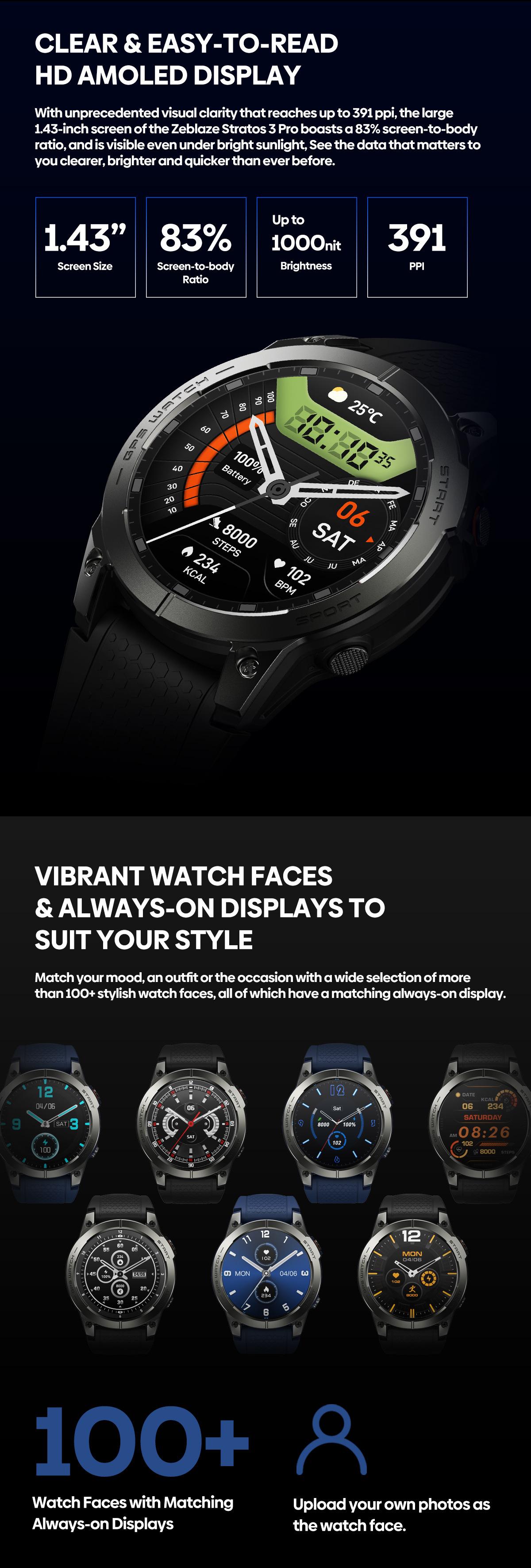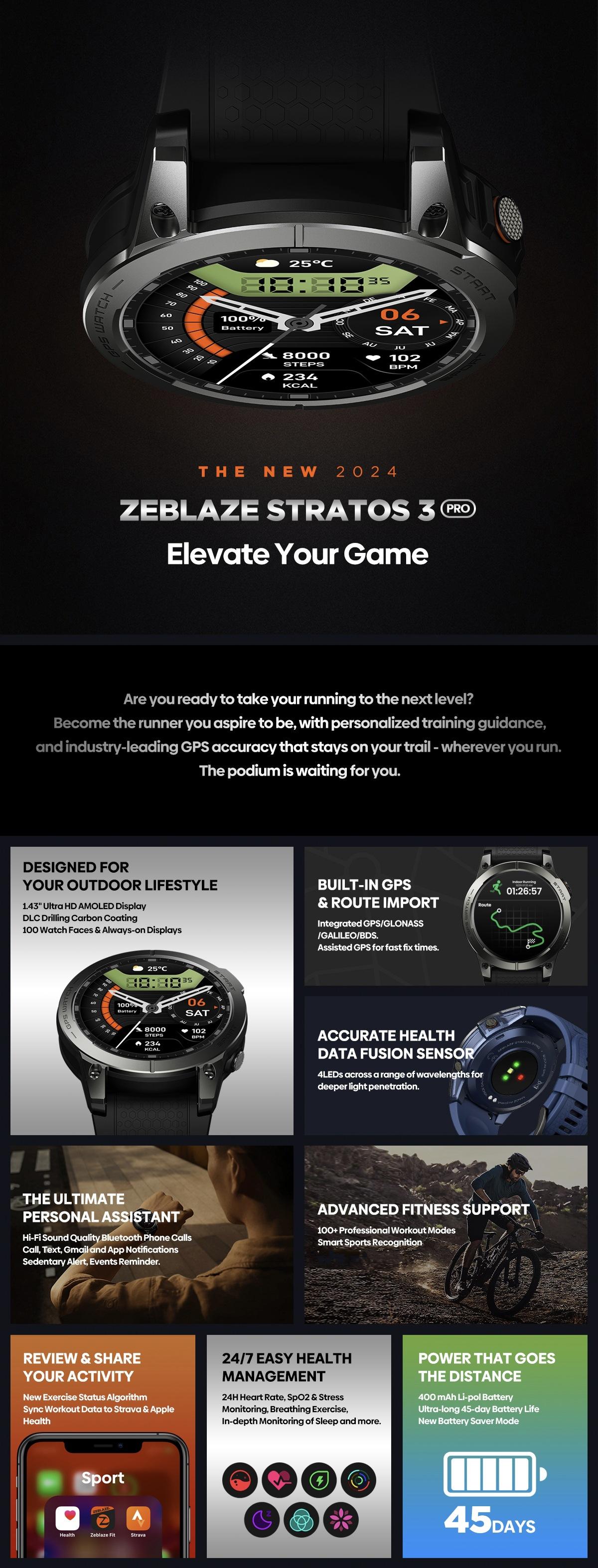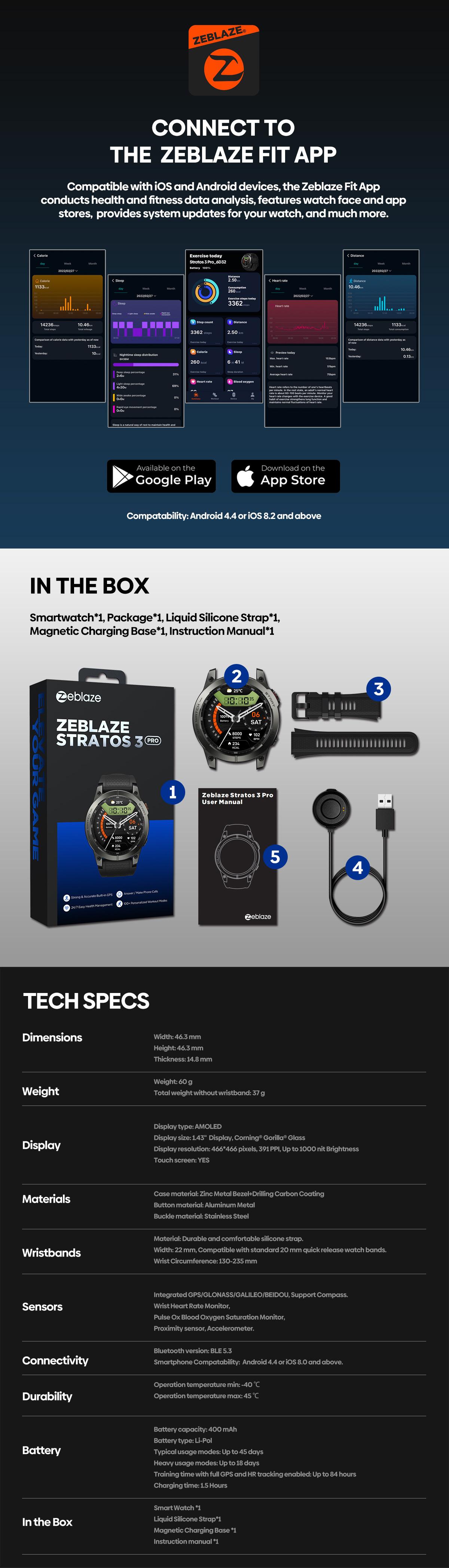 El peso bruto del Stratos 3 Pro (con embalaje) es de aproximadamente 209 g, y el peso neto es de 60 g (la correa del reloj es negra o azul). El embalaje es una caja de papel rectangular negra con un tamaño de 162 x 95 x 35mm,Caja: 50 unidades, 11.2kilogramo,49.5 x 35.5 x 20 cm。