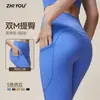 Nuevos pantalones de yoga y fitness de cintura alta con doble M para levantar la cadera, que contraen el vientre, ajustados, de color melocotón, para deportes de fitness, sin vergüenza.