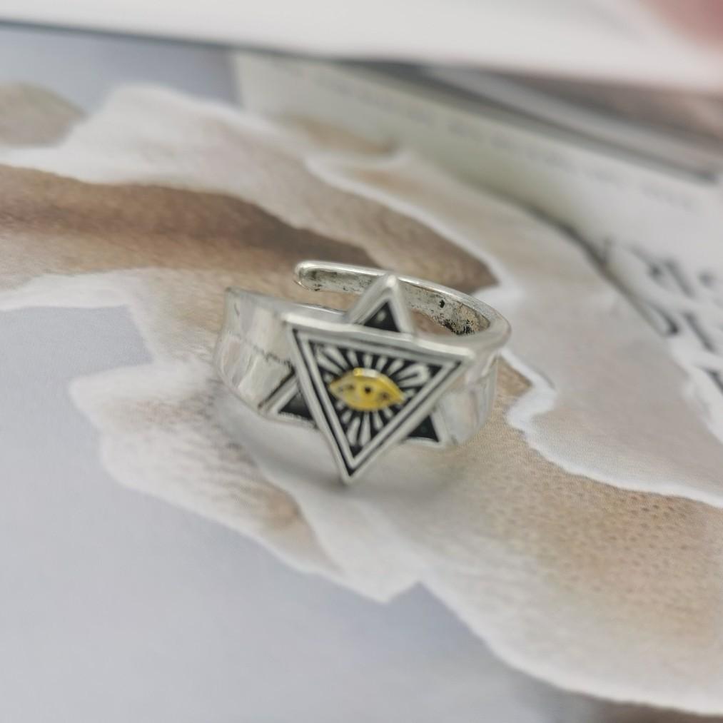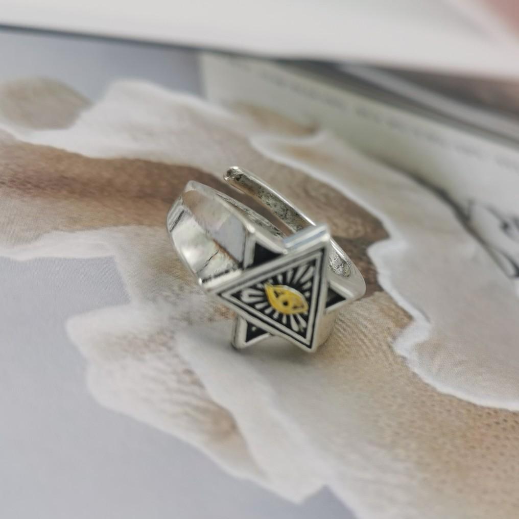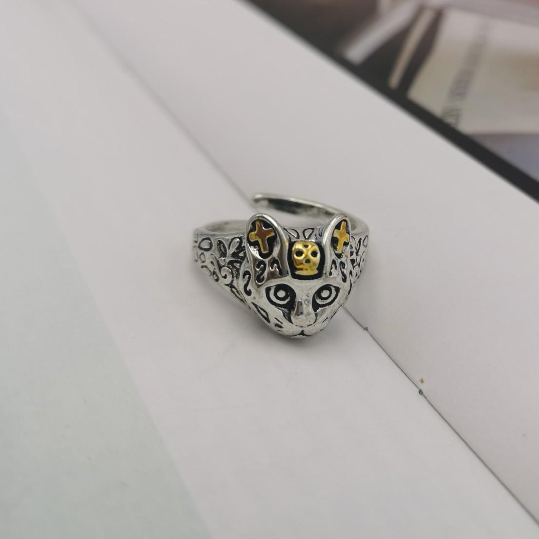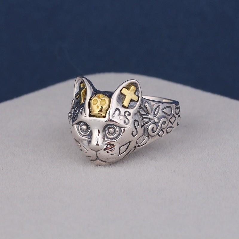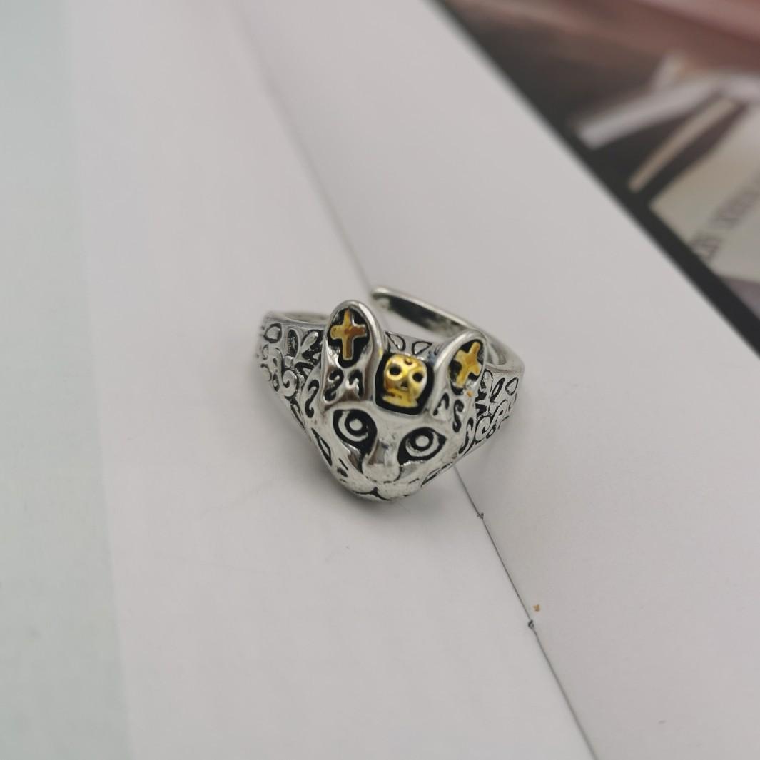 Anillo abierto vintage de plata tailandesa tridimensional con diseño de gatito personalizado en dos colores, con forma de ojo de Dios, estilo hip hop para hombre, con estrella de seis puntas.