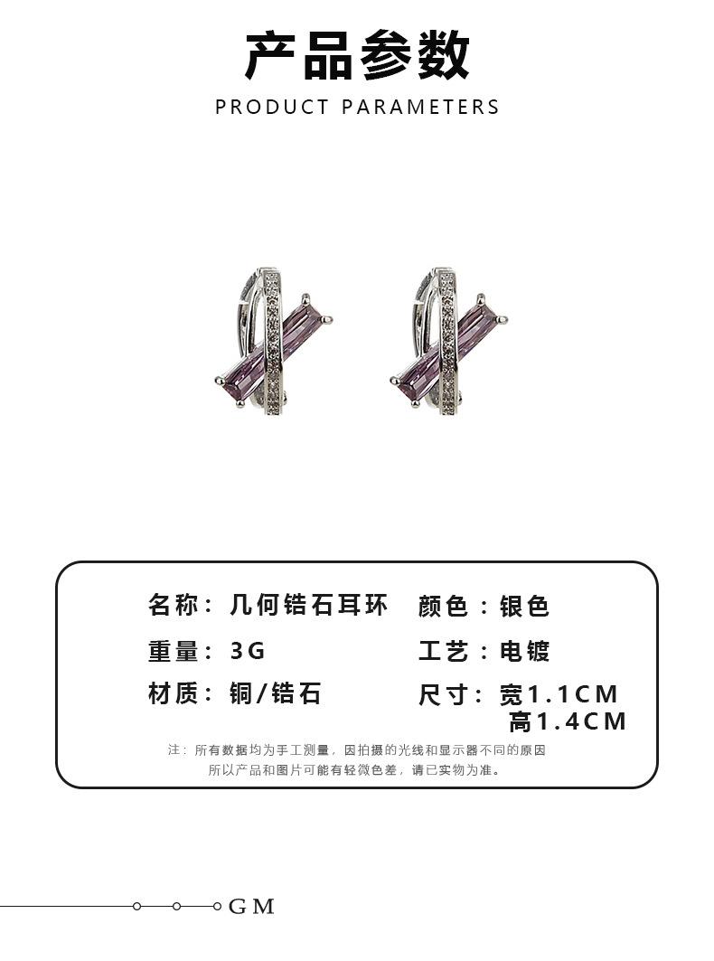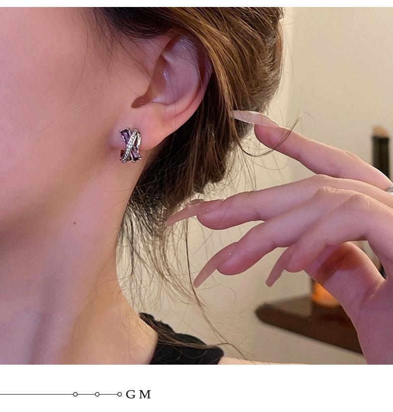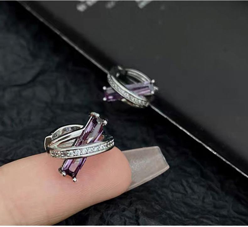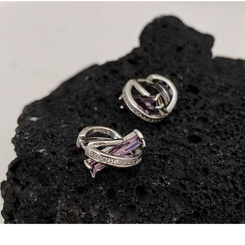 Pendientes de circonita geométrica morada para mujer, sencillos, combinables con todo, de alta gama, ligeros, de lujo, de moda, con diseño de nicho, con hebilla para la oreja.