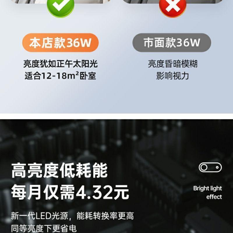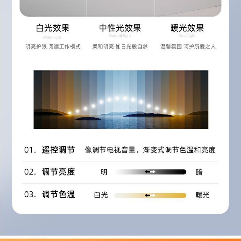 High gloss white light, Three color dimming, Stepless dimming + remote control