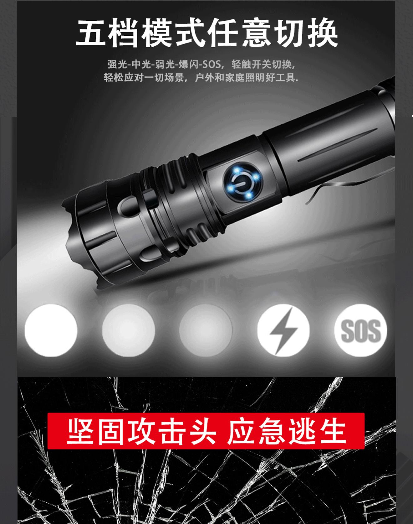 [Modo]: Luz fuerte-Luz media-Luz débil-Estroboscópico-SOS-COB