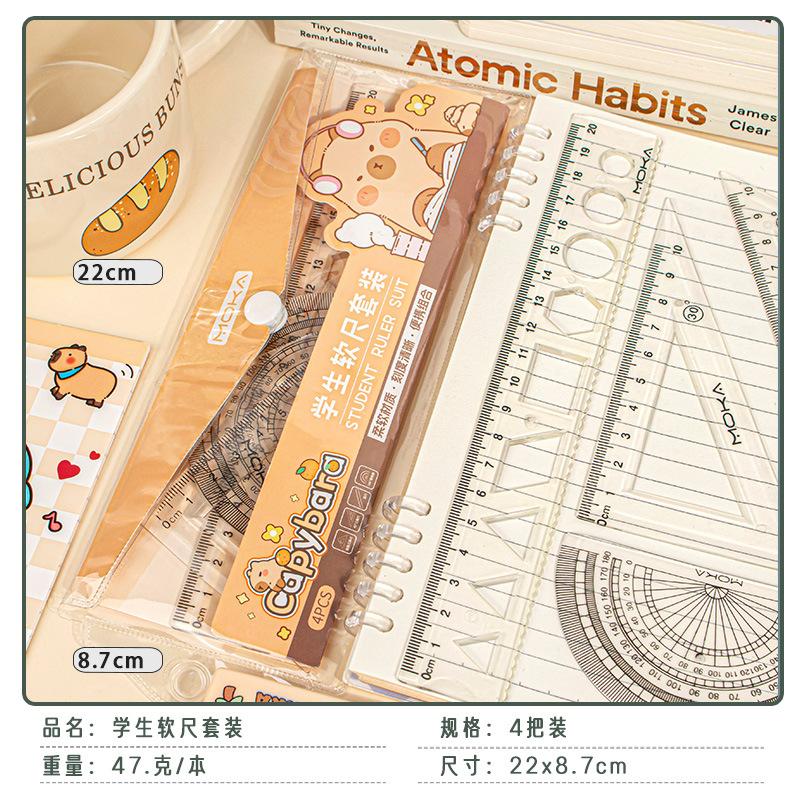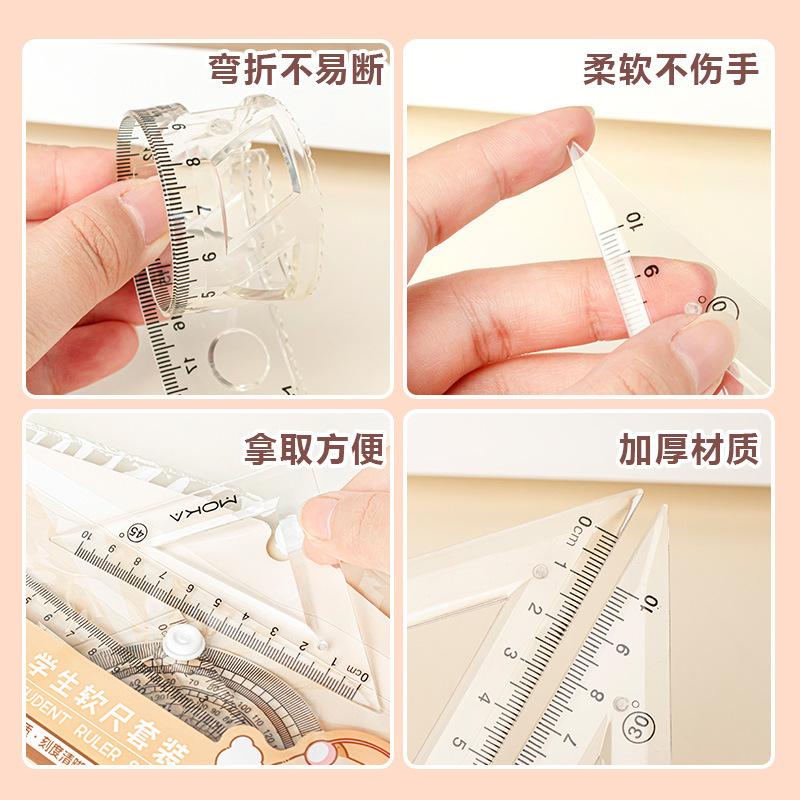 Juego de reglas de dibujos animados de cuatro piezas para estudiantes de escuela primaria, regla suave de 20 cm, transportador, suministros de aprendizaje multifuncionales, papelería al por mayor