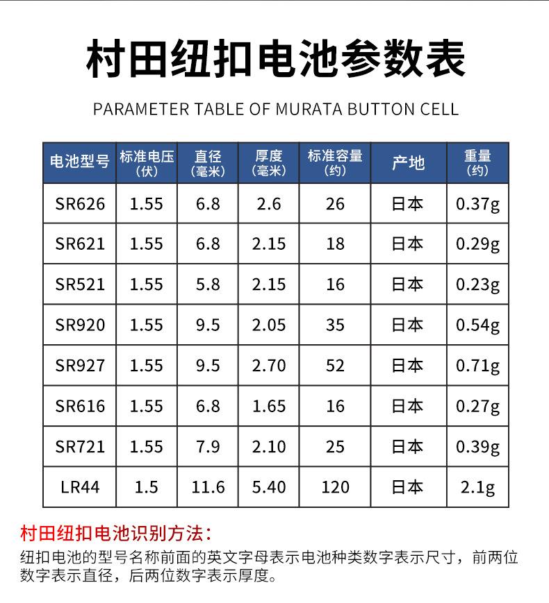 LR44, LR41, LR43, LR1130, LR1120, SR726 397, SR712 346, SR416 337, SR516 317, SR936 394, SR616 321, SR716 315,...