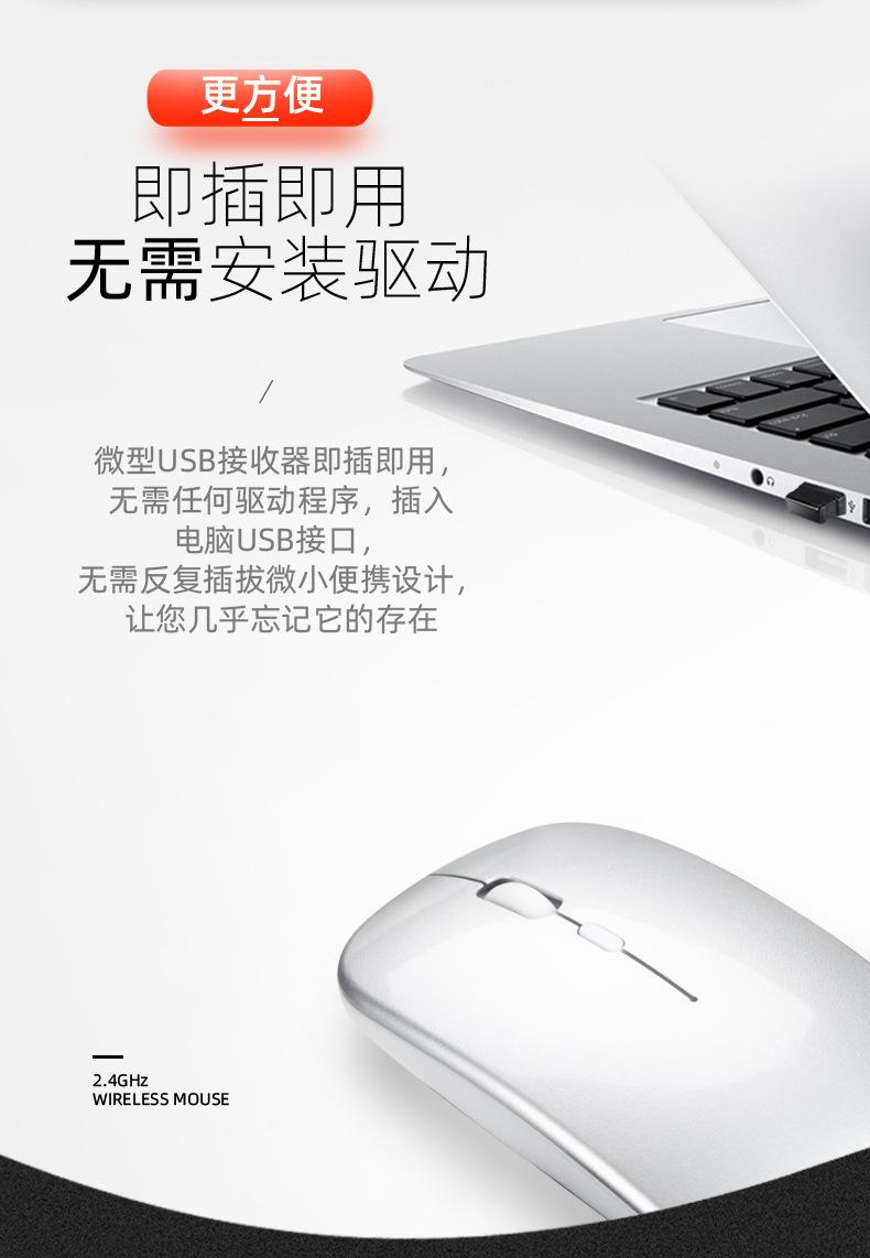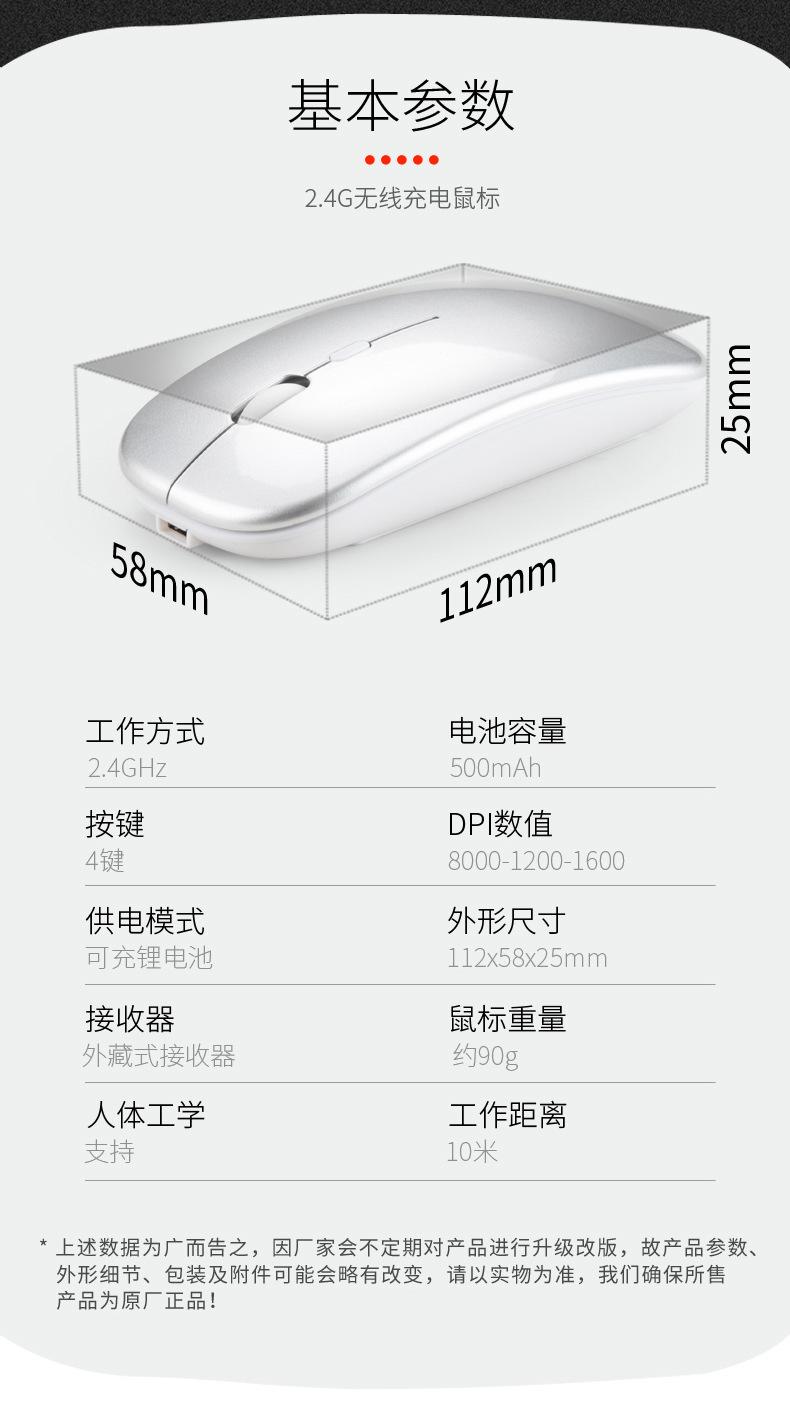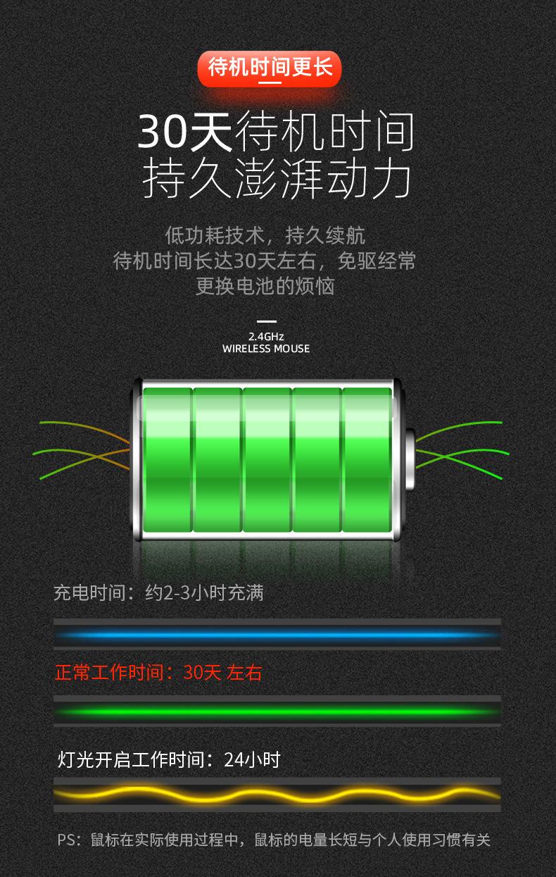 2. El ratón utiliza una batería de litio suficiente, que se puede cargar 1,000 veces. Cada carga tarda aproximadamente tres horas y se puede usar durante unos 50 días. El ratón no requiere controlador y es plug-and-play. Entra en modo de ahorro de energía en unos 10 segundos y en modo de suspensión en unos 5 minutos. Después de la suspensión, se puede activar haciendo clic en cualquier tecla del ratón.