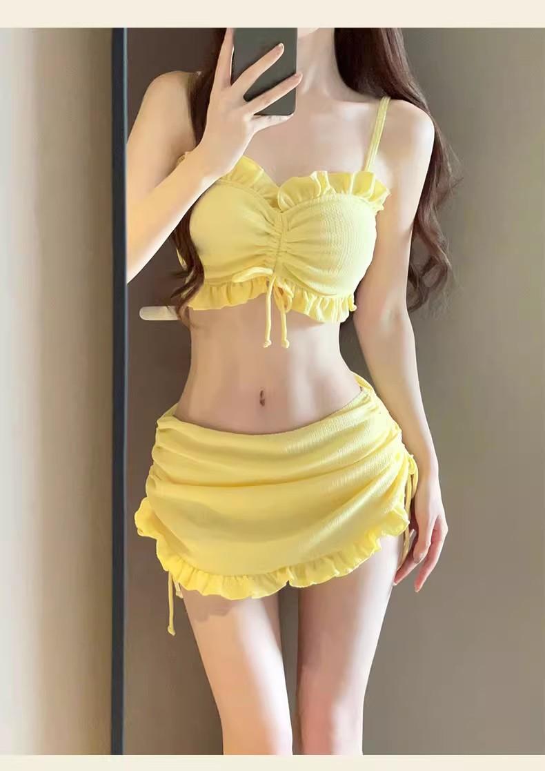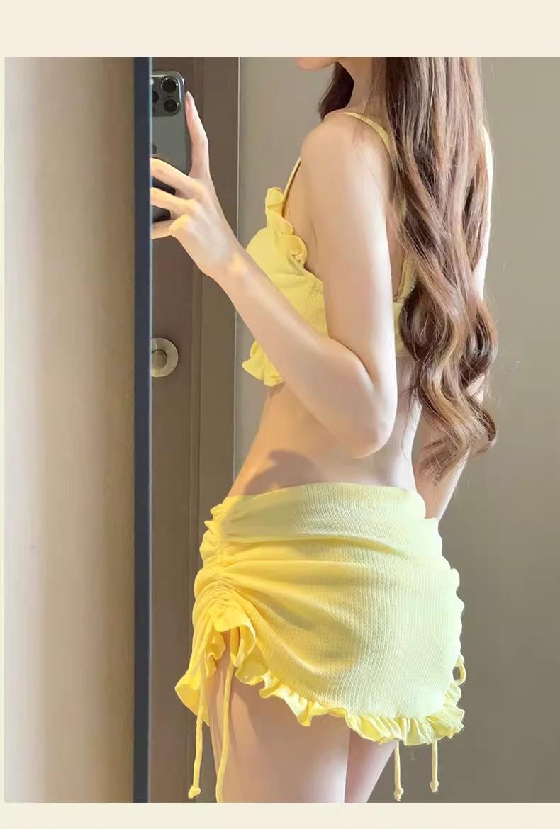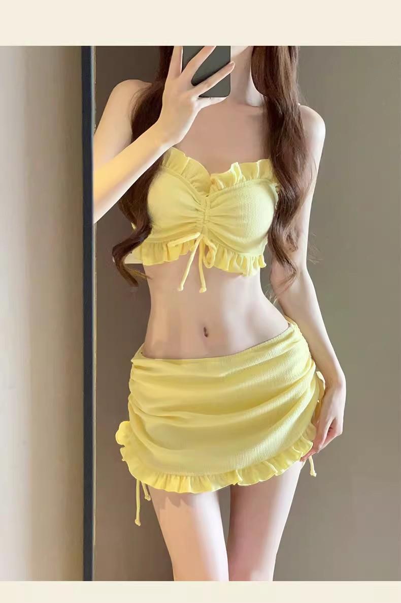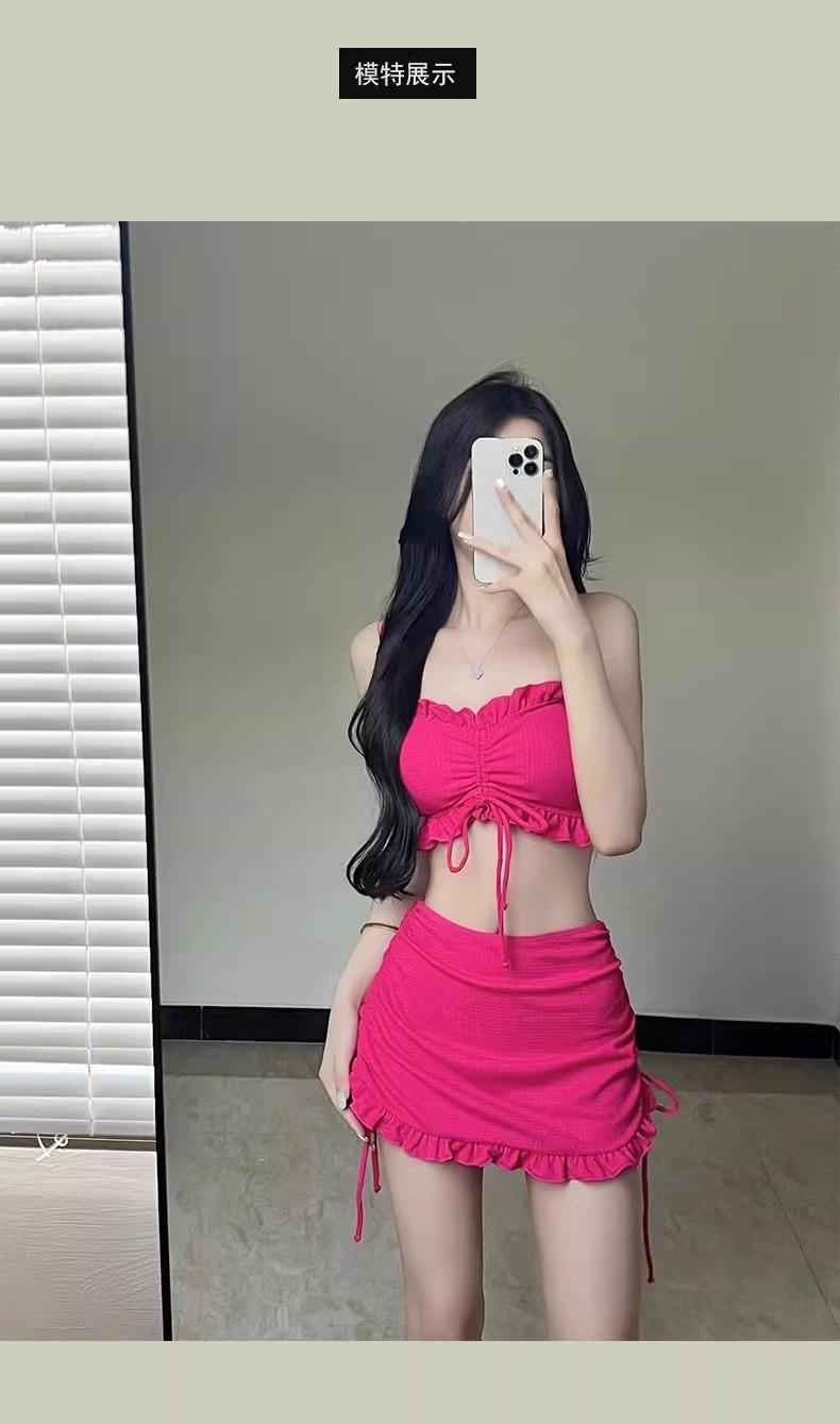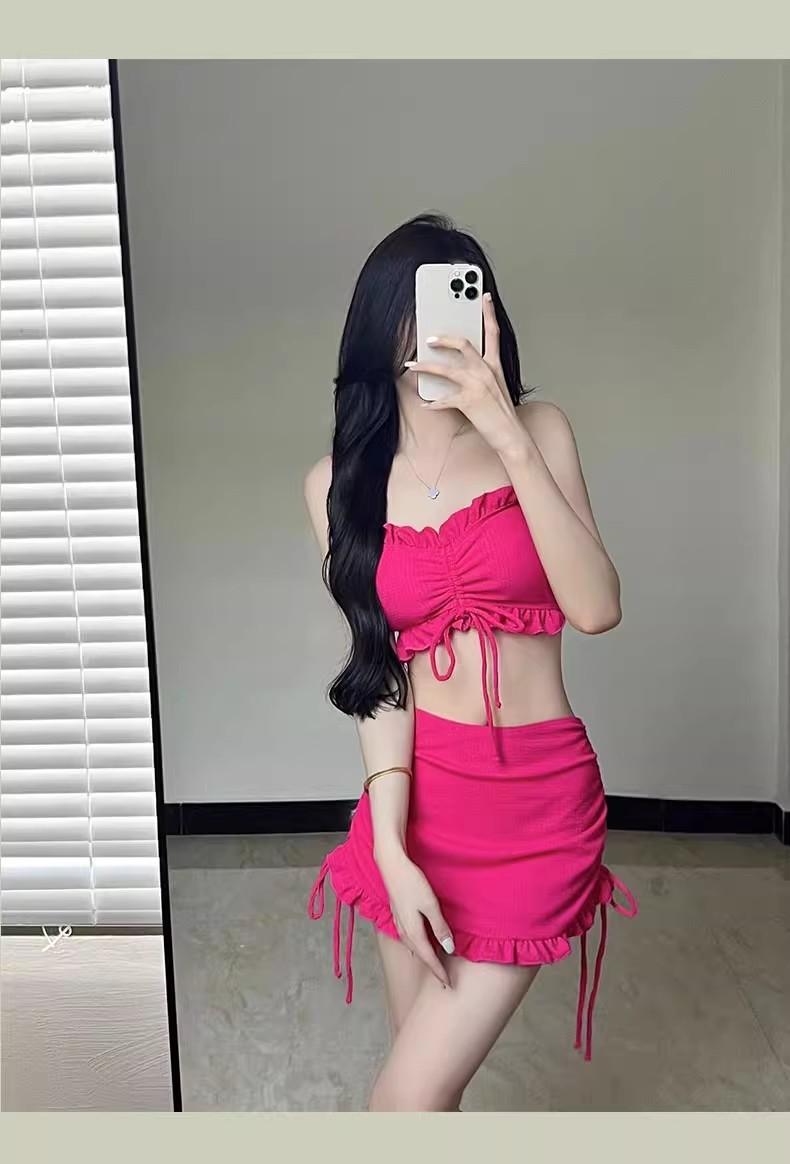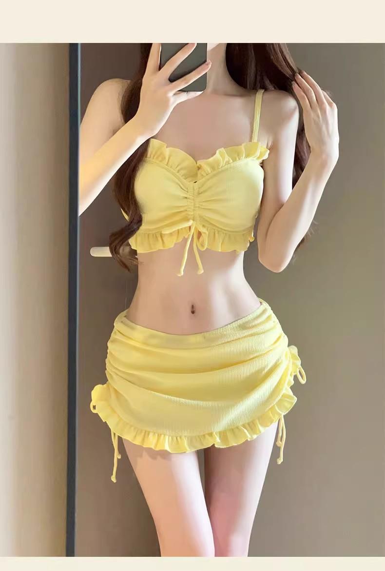 Traje de baño de bikini para mujer, verano 2024, nuevo, falda blanca ajustada, fruncido, vacaciones en la playa, sexy, dividido, conjunto de tres piezas
