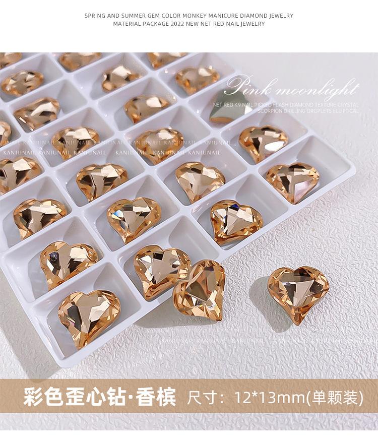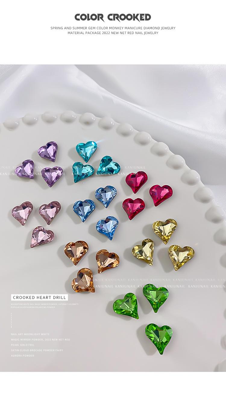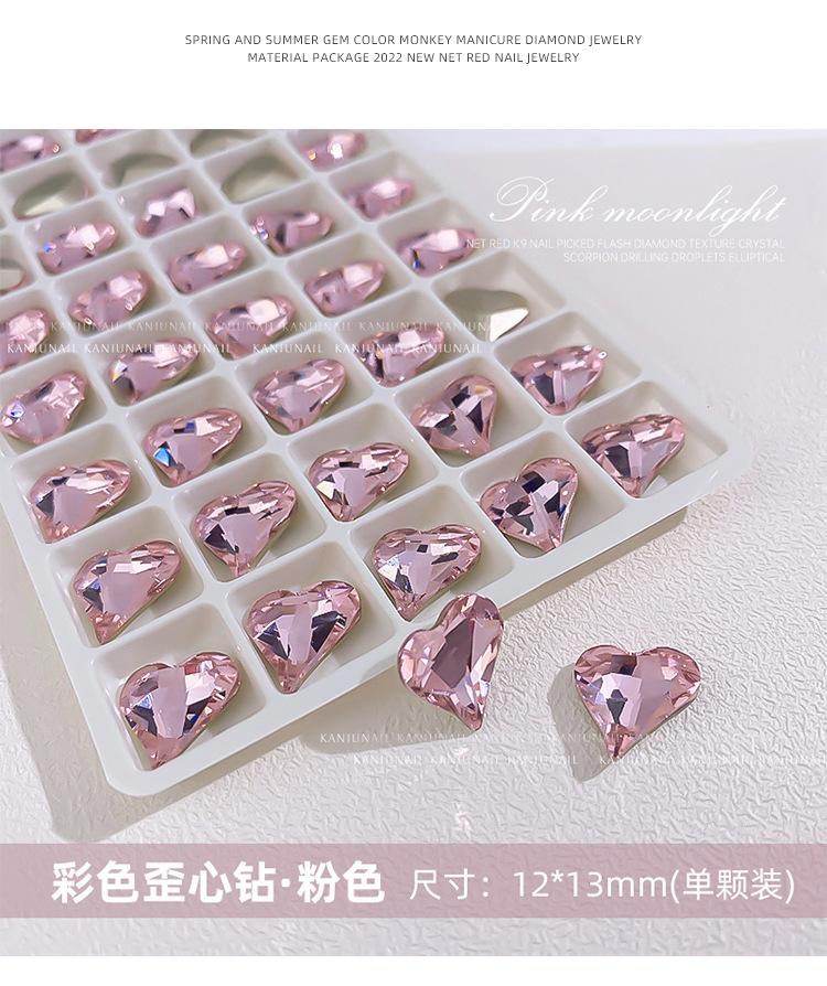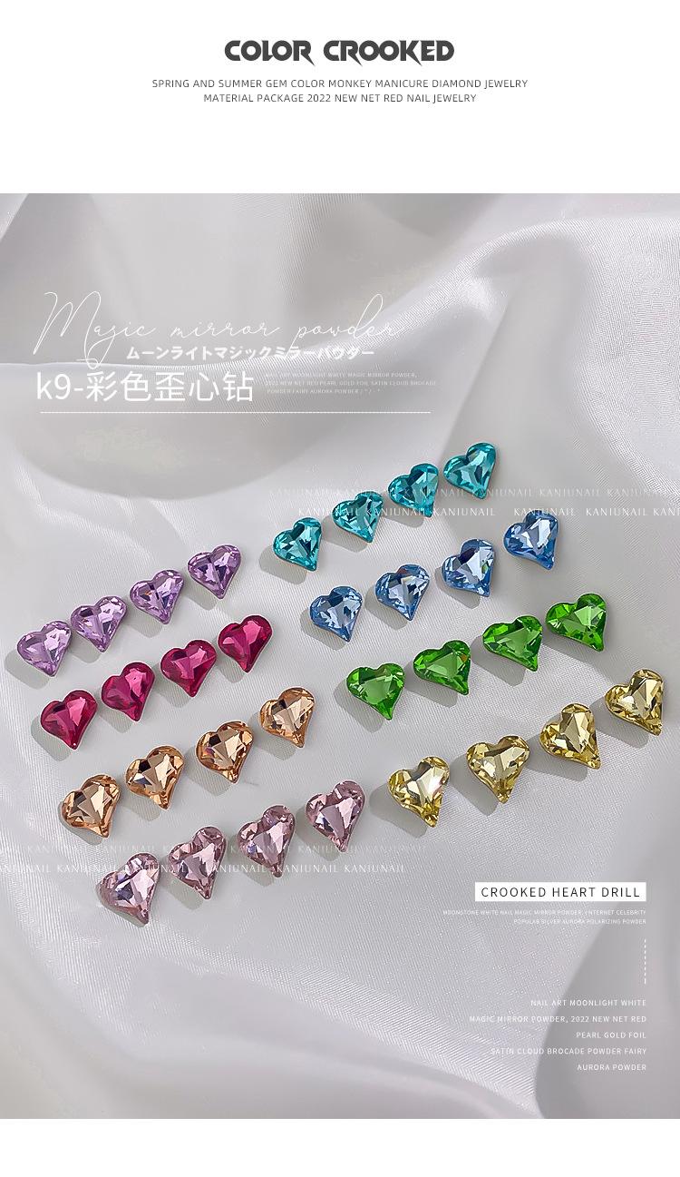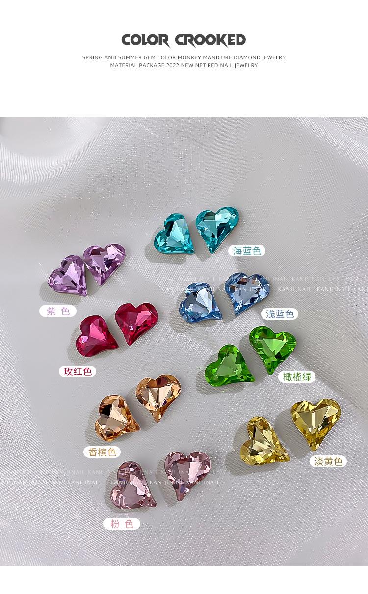 Venta al por mayor de joyas de diamantes para uñas, explosiones rojas, amor, fondo puntiagudo, diamante azul claro, rosa, corazón torcido, diamante, uñas de vidrio K9, diamante