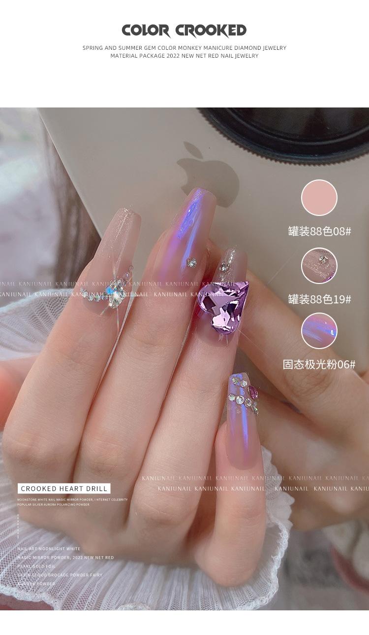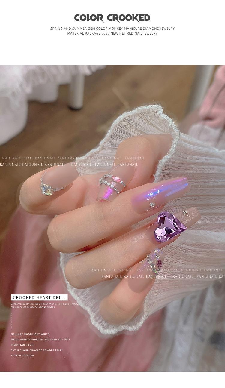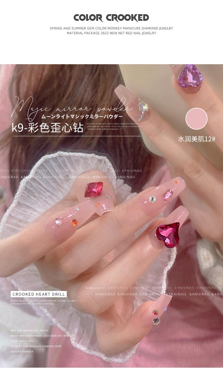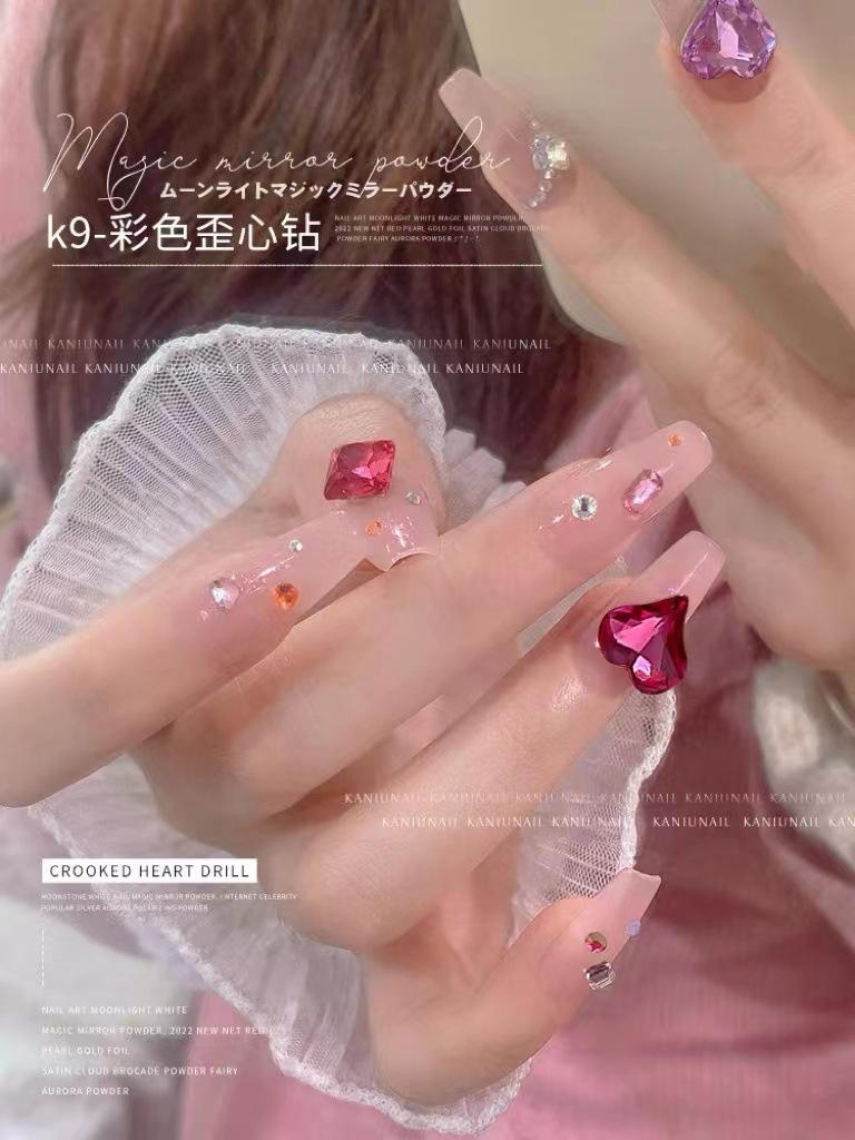 Venta al por mayor de joyas de diamantes para uñas, explosiones rojas, amor, fondo puntiagudo, diamante azul claro, rosa, corazón torcido, diamante, uñas de vidrio K9, diamante