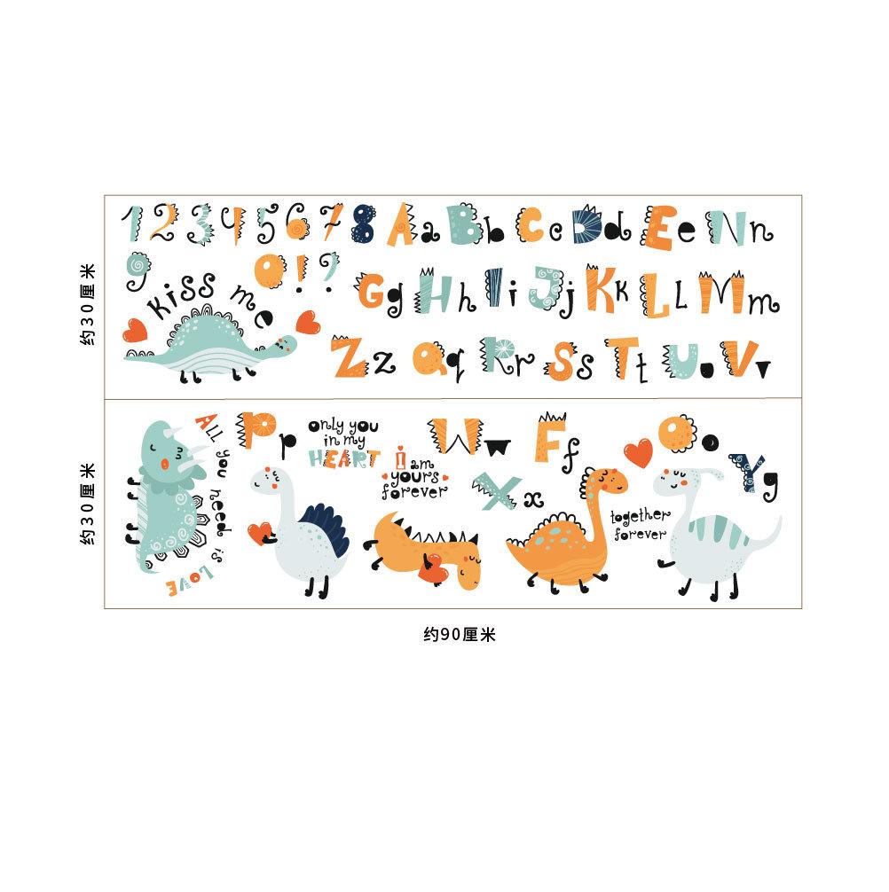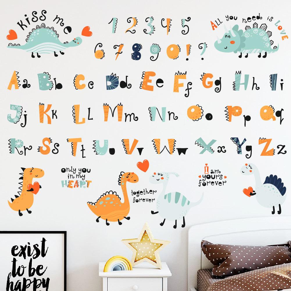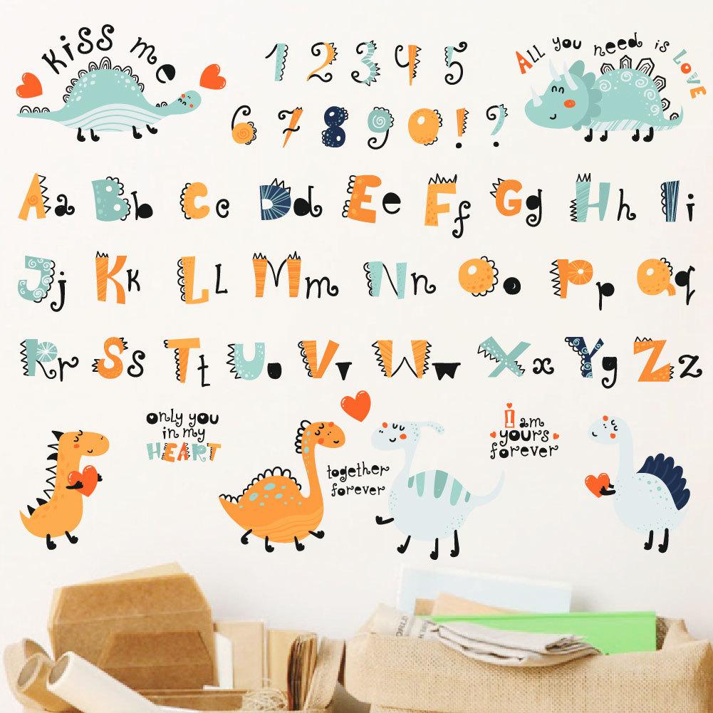 Pegatinas de letras de dinosaurios de dibujos animados para la habitación de los niños, pegatinas decorativas de pared para la mesita de noche, pegatinas digitales de educación temprana para jardín de infantes