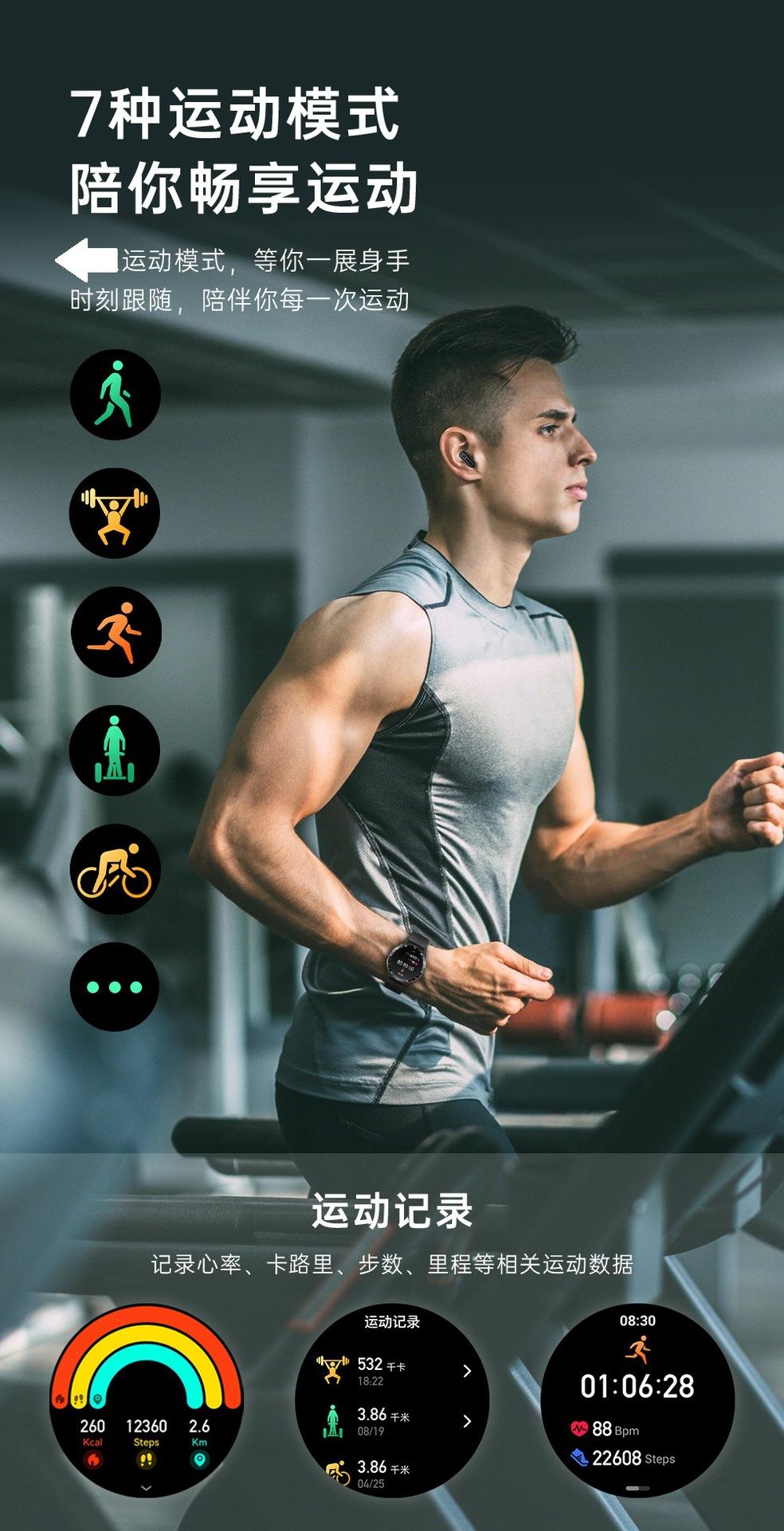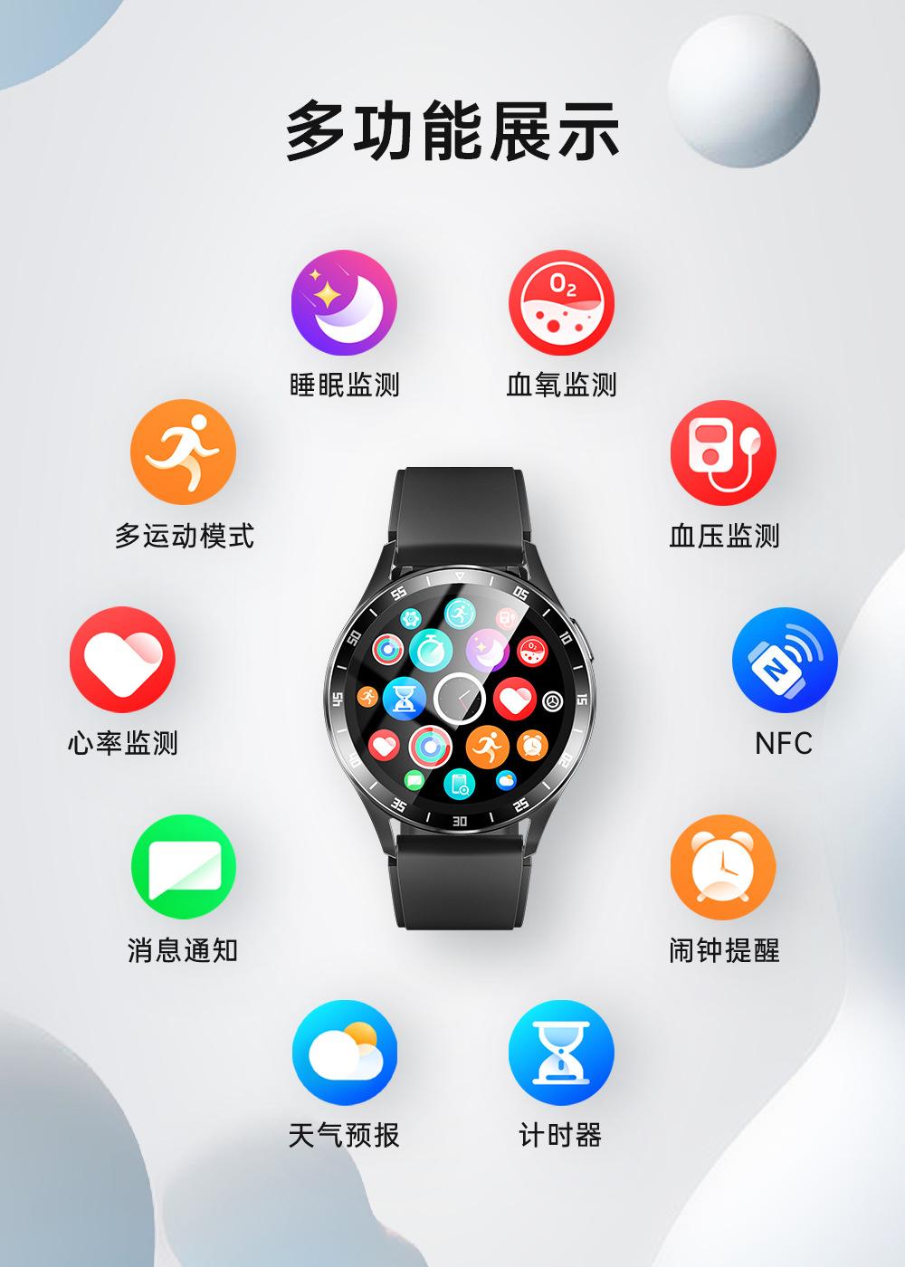 Características: Llamada Bluetooth, táctil completo, frecuencia cardíaca, agitar para tomar fotos, recordatorio/rechazo de llamadas, almacenamiento de información, modo multideporte, clima, soporte chino Alipay, NFC