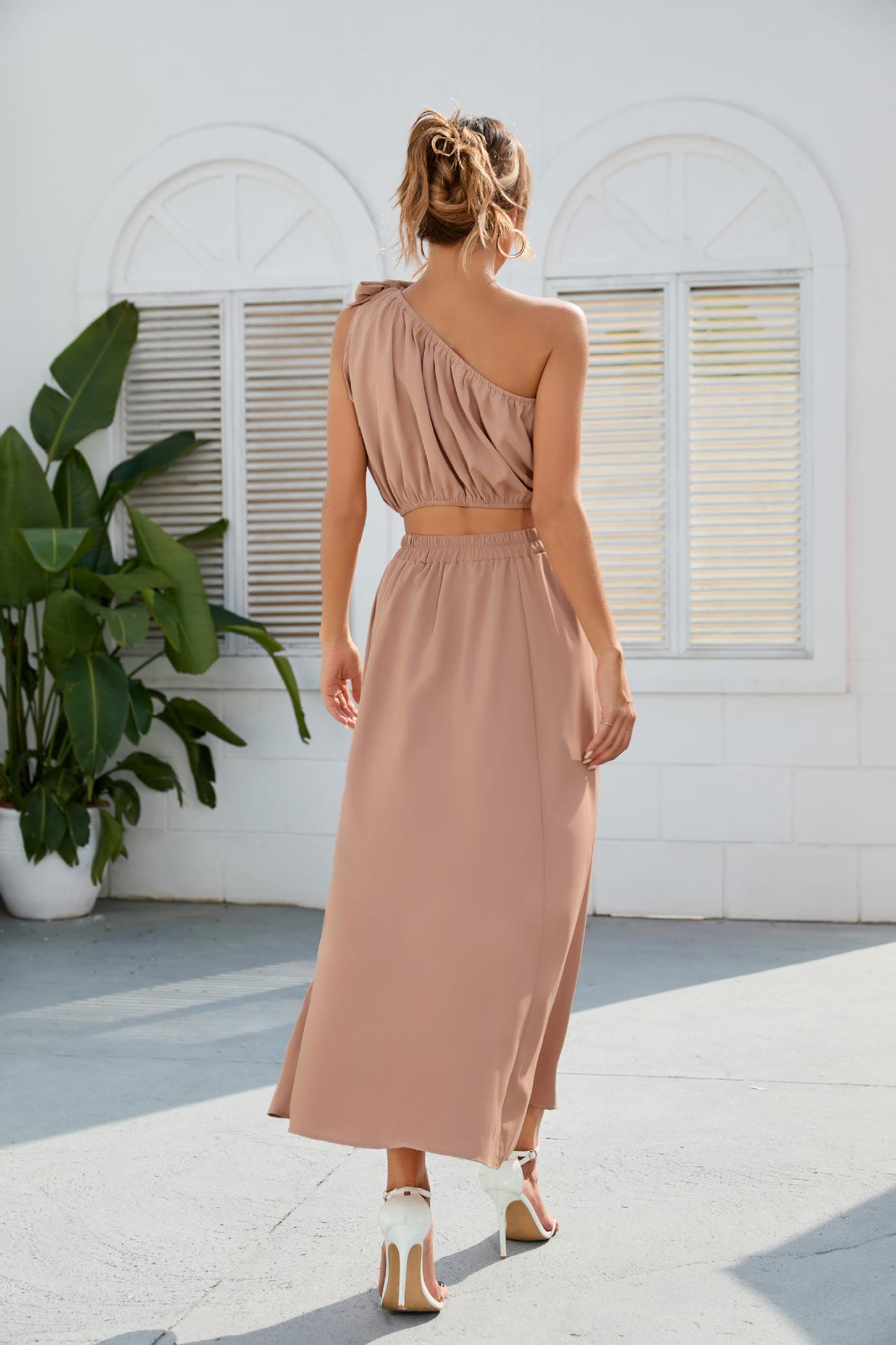 Compra Traje de Lazo de Hombro Inclinado de Moda para Mujer de Estación Independiente de Amazon 2025 Vestido de Vuelo Completo con Abertura Conjunto de Dos Piezas para Mujer al por mayor en Joom.pro
