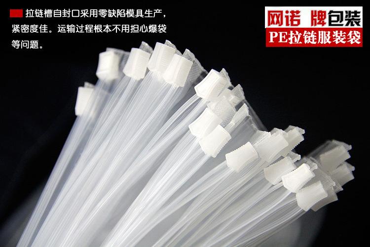 | 20 x 28 cm x 12 cables | 0.18 yuan/pieza | 0.80Kg/100pcs | Con cremallera | Adecuado para ropa de adulto, suéteres delgados de hombre, camisetas, pantalones, etc. |
