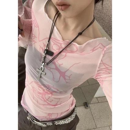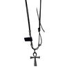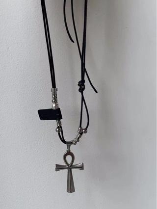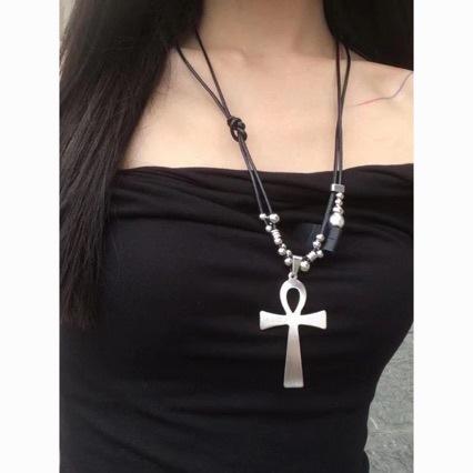 Collar con colgante de cruz de acero y titanio con cuerda de cuero y cuentas redondas cosidas, diseño de personalidad de nicho, cadena de clavícula de viento frío de moda para mujer