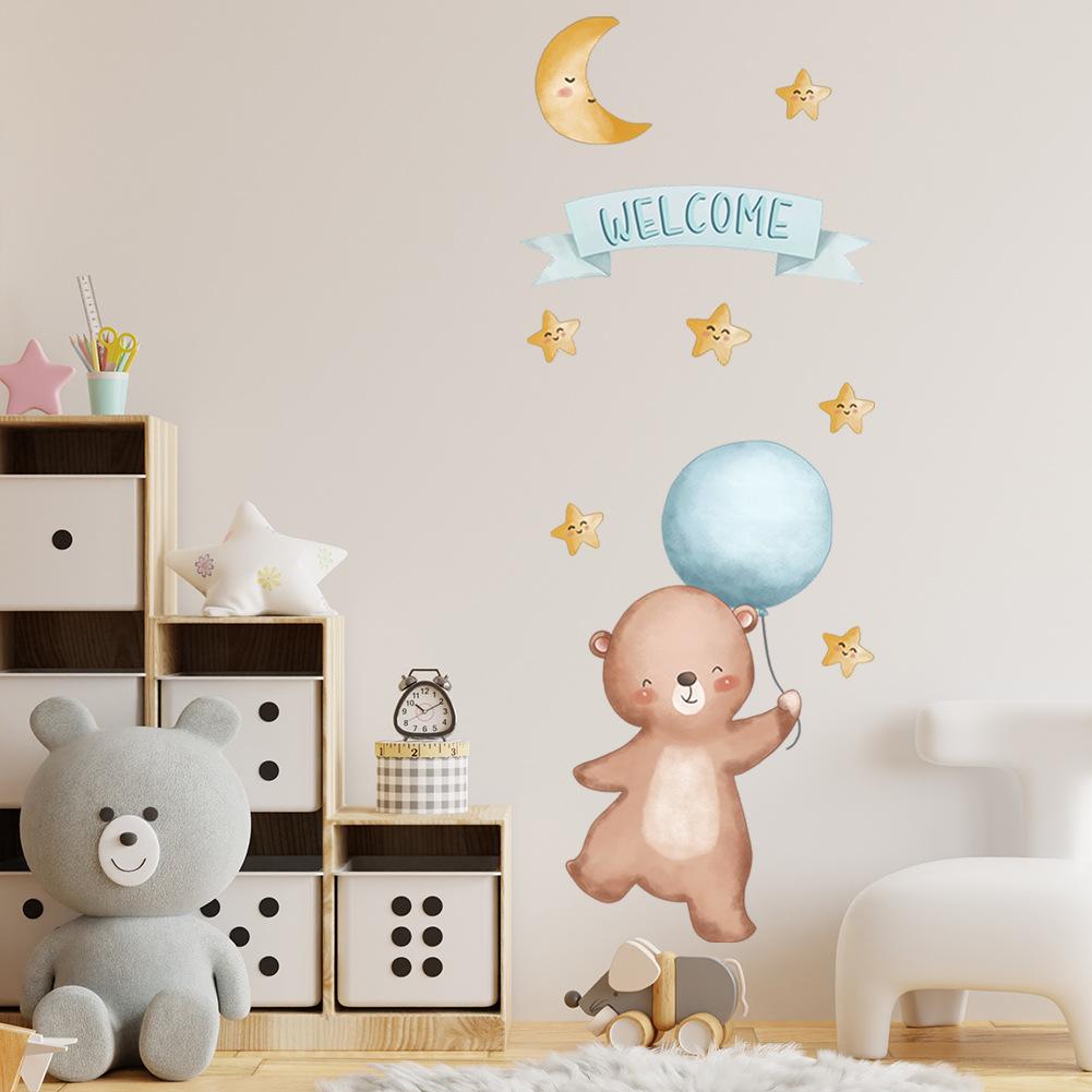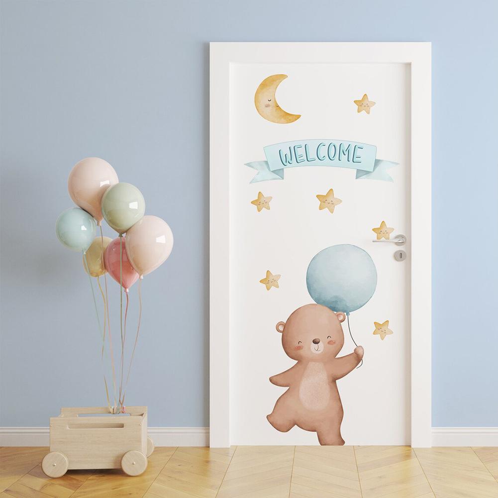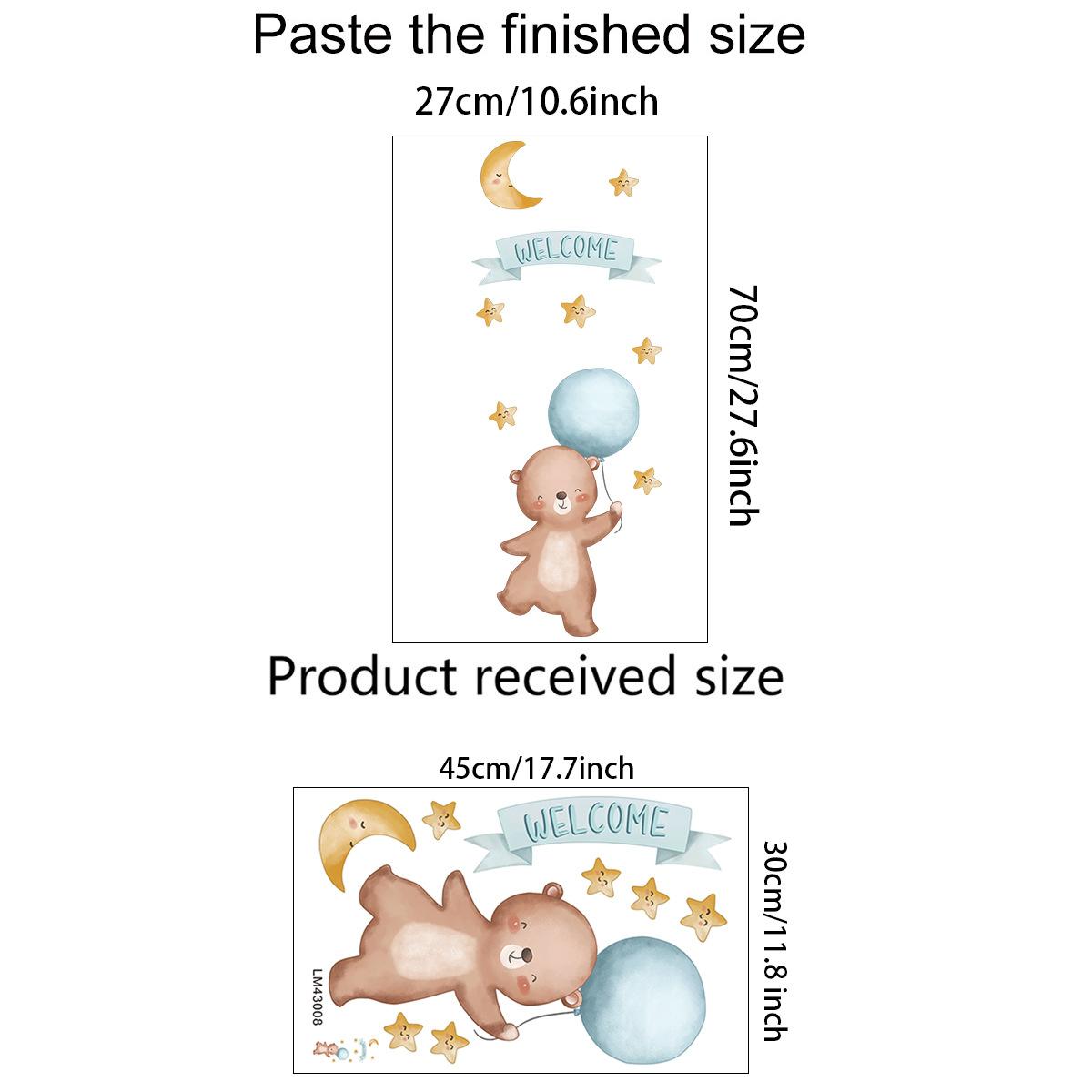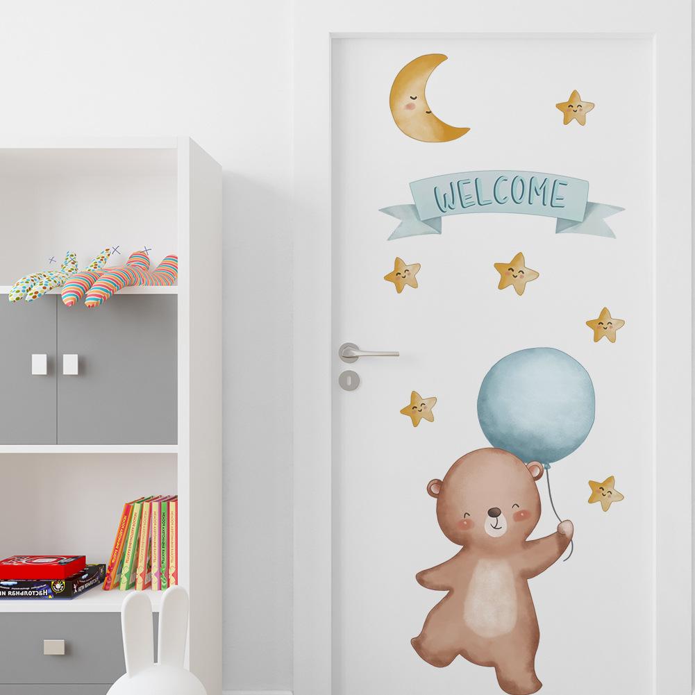 Pegatina de pared con diseño de oso de dibujos animados, globo, estrella y luna, para puerta de habitación infantil, papel pintado decorativo para embellecer el jardín de infancia, autoadhesivo