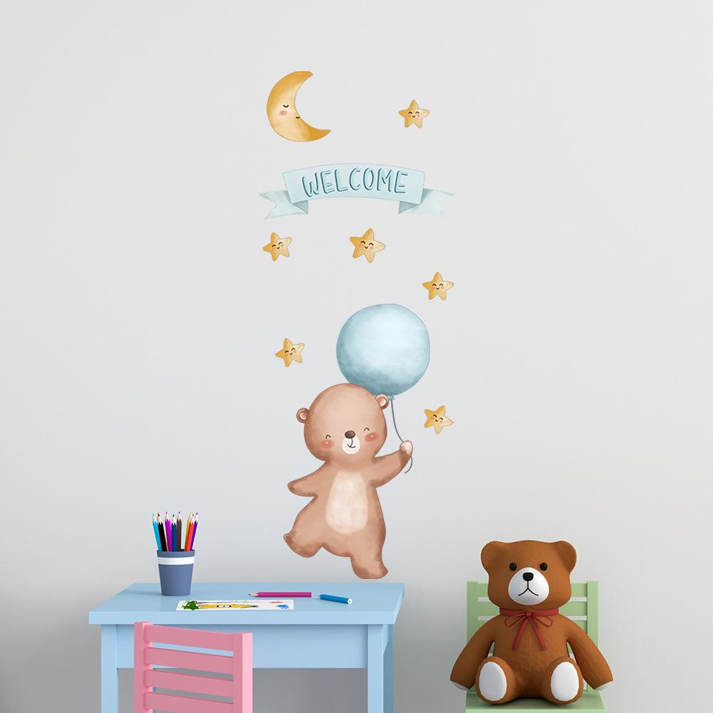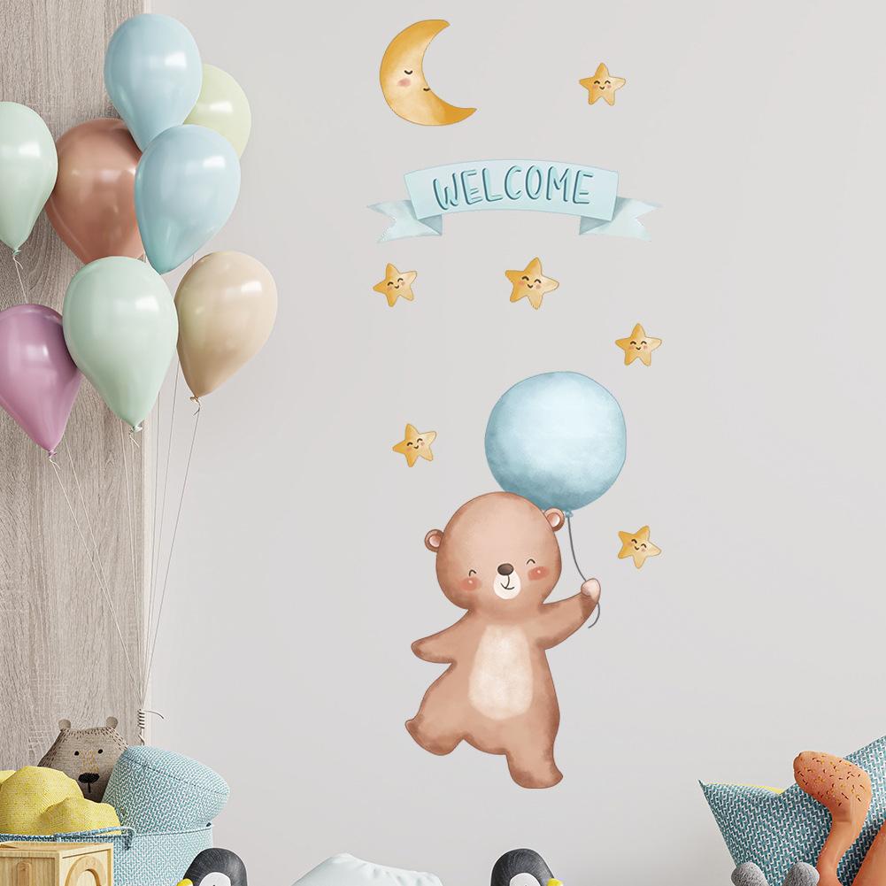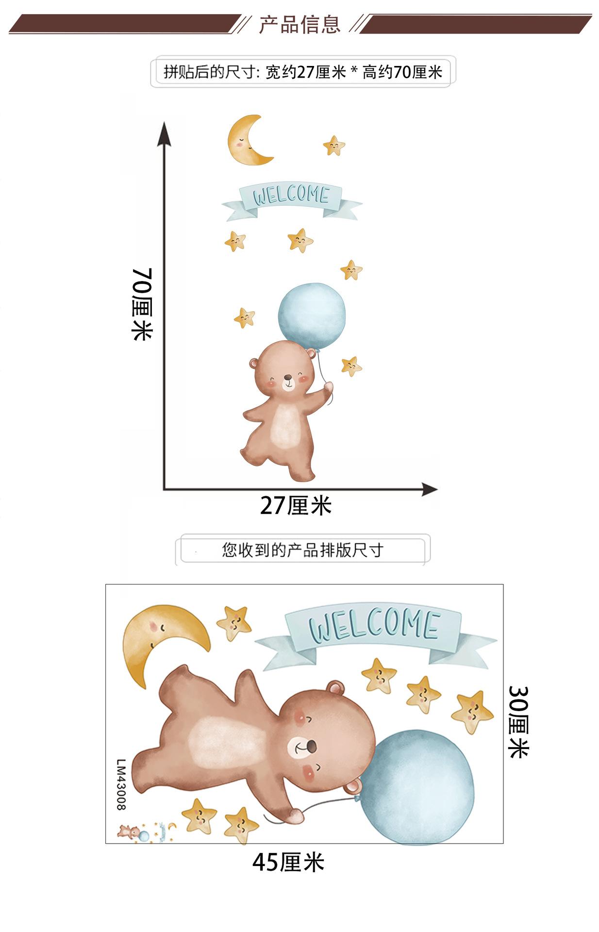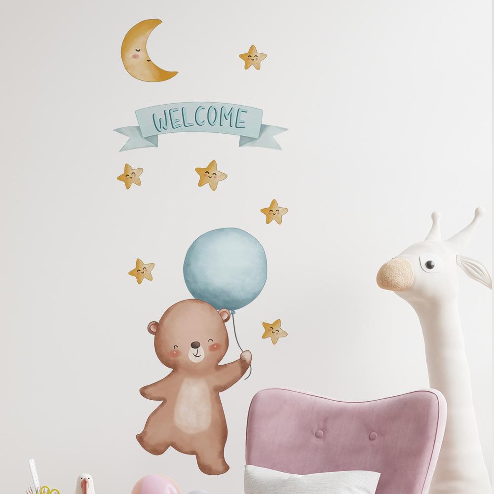 Pegatina de pared con diseño de oso de dibujos animados, globo, estrella y luna, para puerta de habitación infantil, papel pintado decorativo para embellecer el jardín de infancia, autoadhesivo