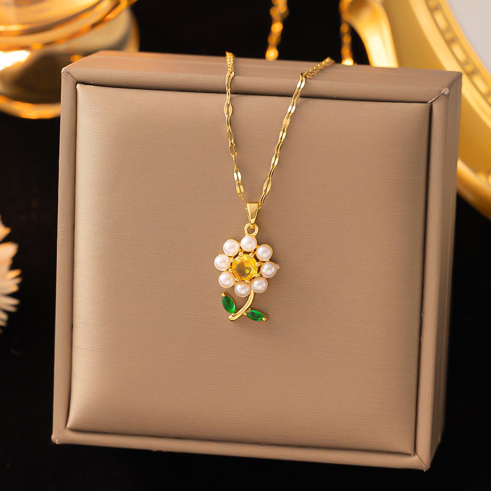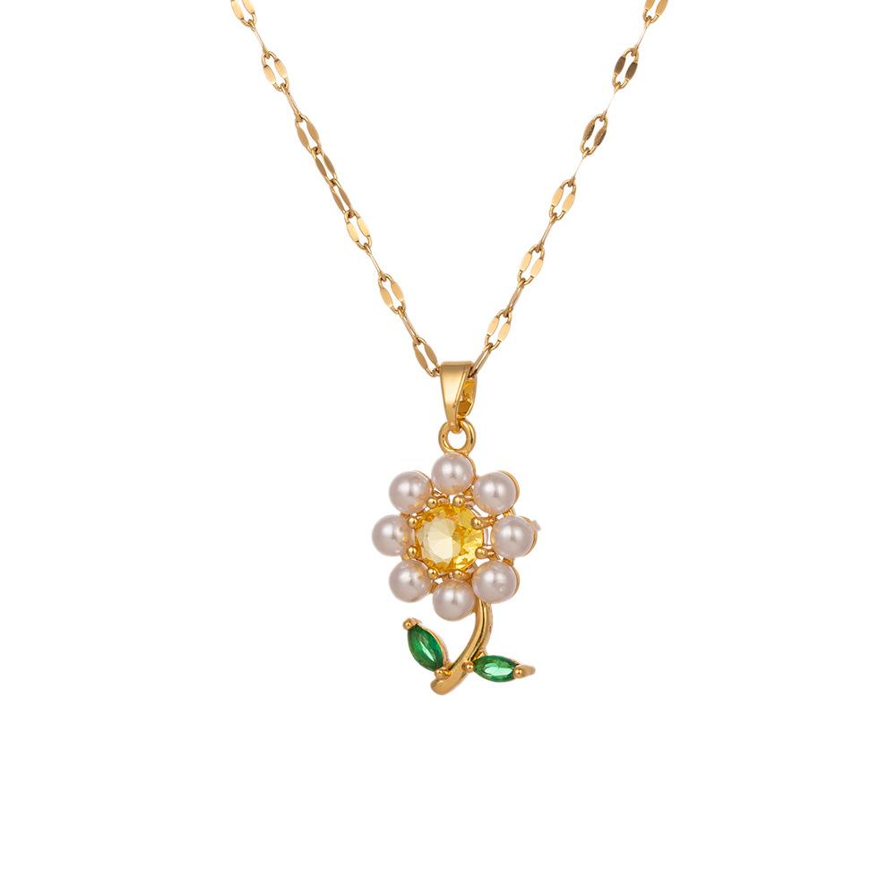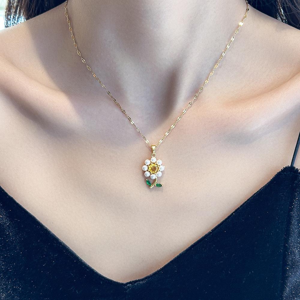 Collar de perlas pequeñas con flores que no se decolora, de moda, para mujer, con un bonito diseño de cadena de clavícula de acero de titanio y personalidad antiedad, con colgante de galvanoplastia