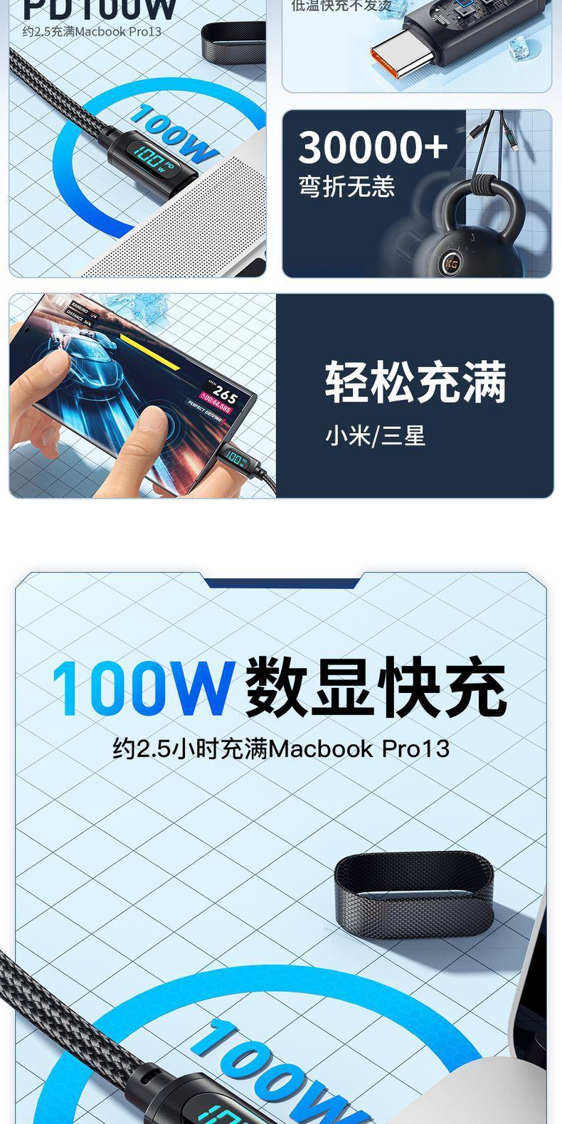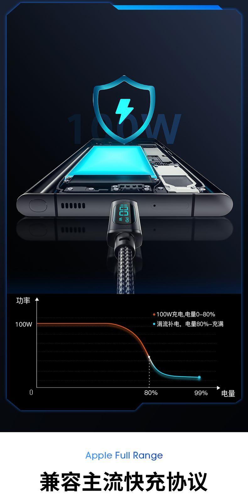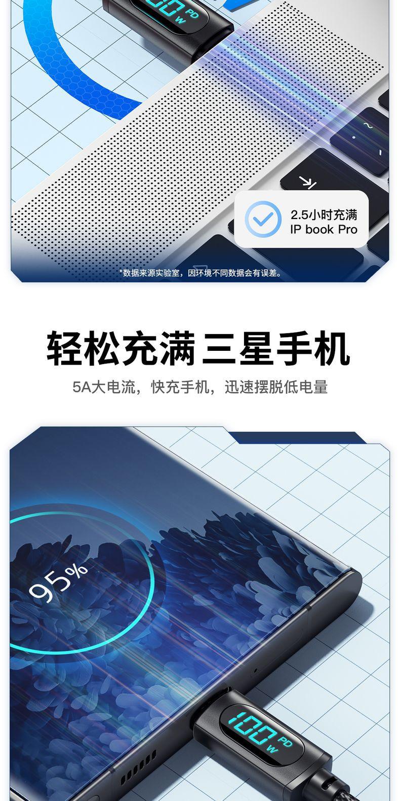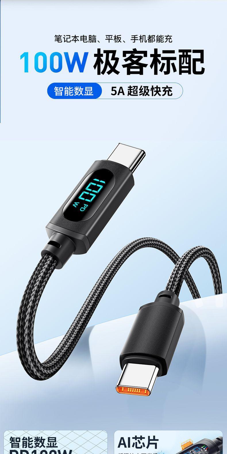 Cable de datos de pantalla digital PD100W, cable de carga rápida tipo C a C, cable de datos tipo C, cable de carga de energía para teléfono móvil y portátil.