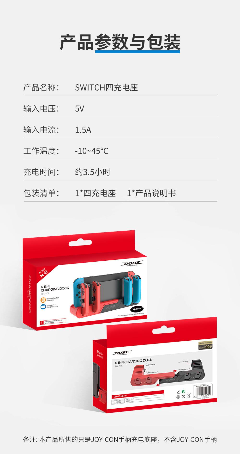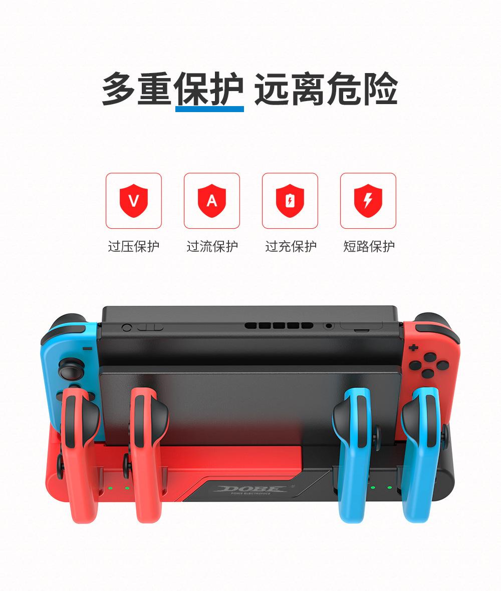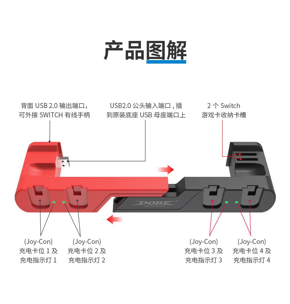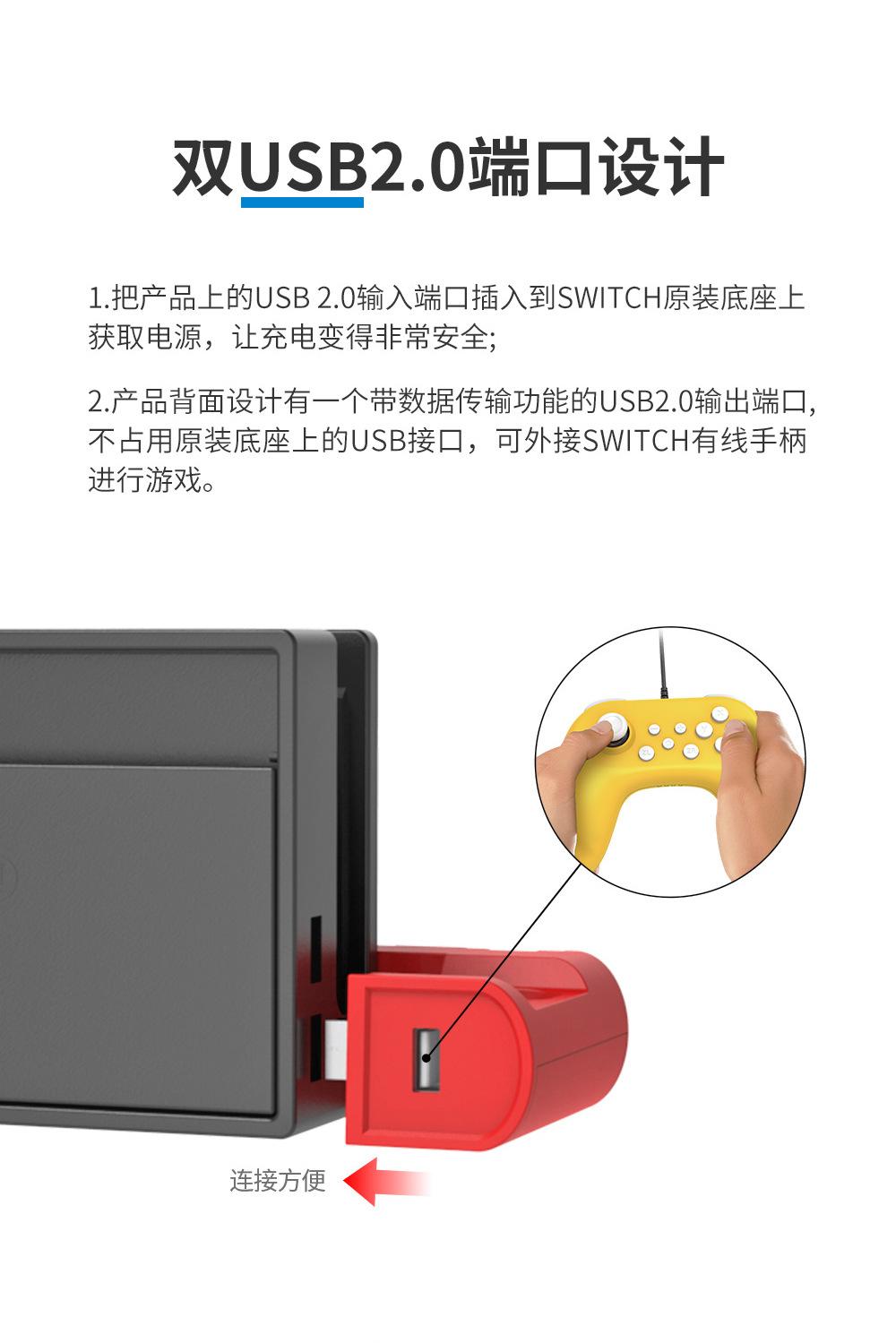 6. Hay un puerto hembra USB2.0 en la parte posterior del producto con función de transmisión de datos USB2.0. Al usar este producto, no ocupa la interfaz USB 2.0 de la base original. Este puerto se utiliza para mandos cableados externos para jugar. Cuando los cuatro mandos pequeños L/R de Switch (JOY-Con) se están cargando, la corriente de salida de este puerto de salida es de 500MA~800MA. Cuando la corriente de carga total de todos los mandos externos de este producto supera los 1500MA, la salida se apagará automáticamente por protección.