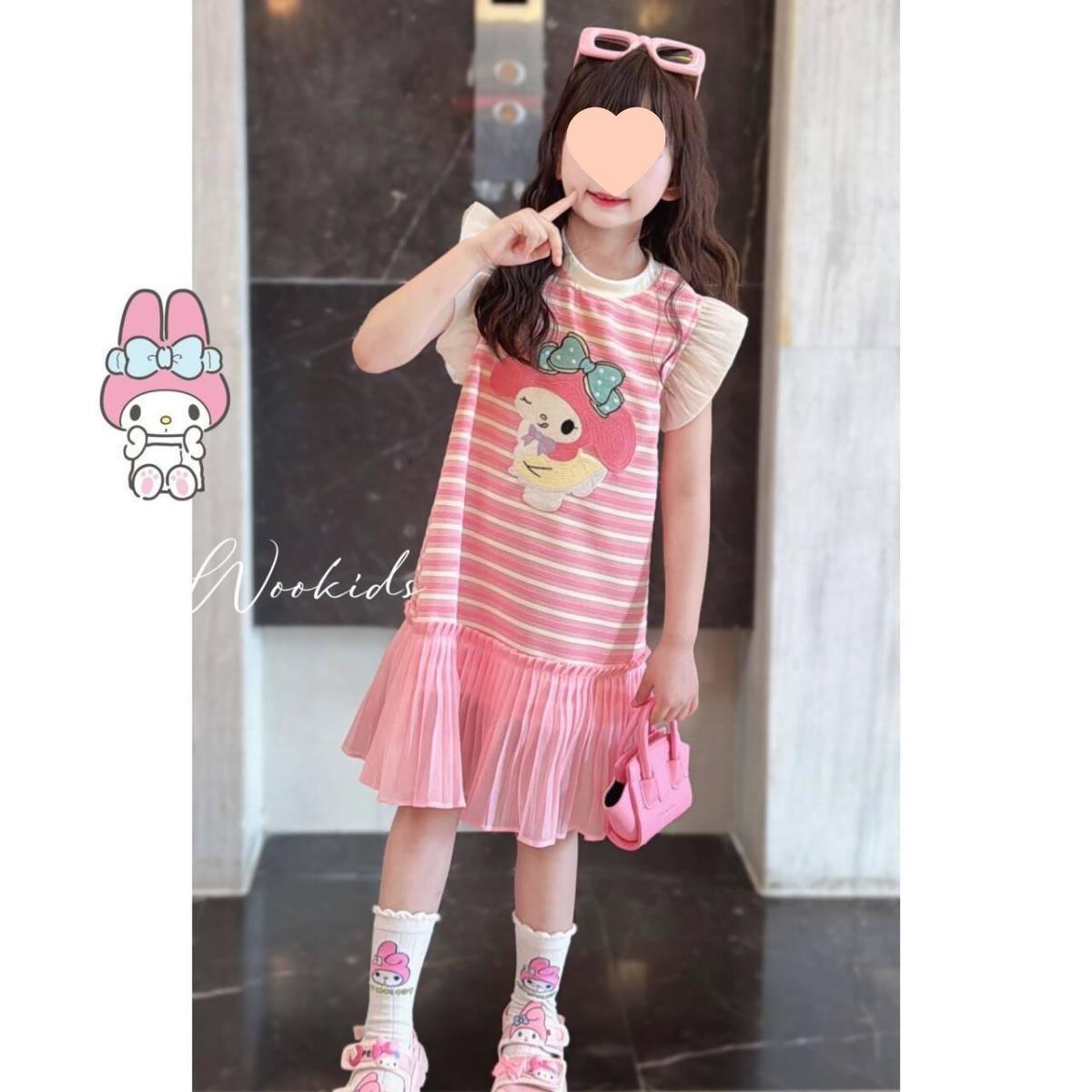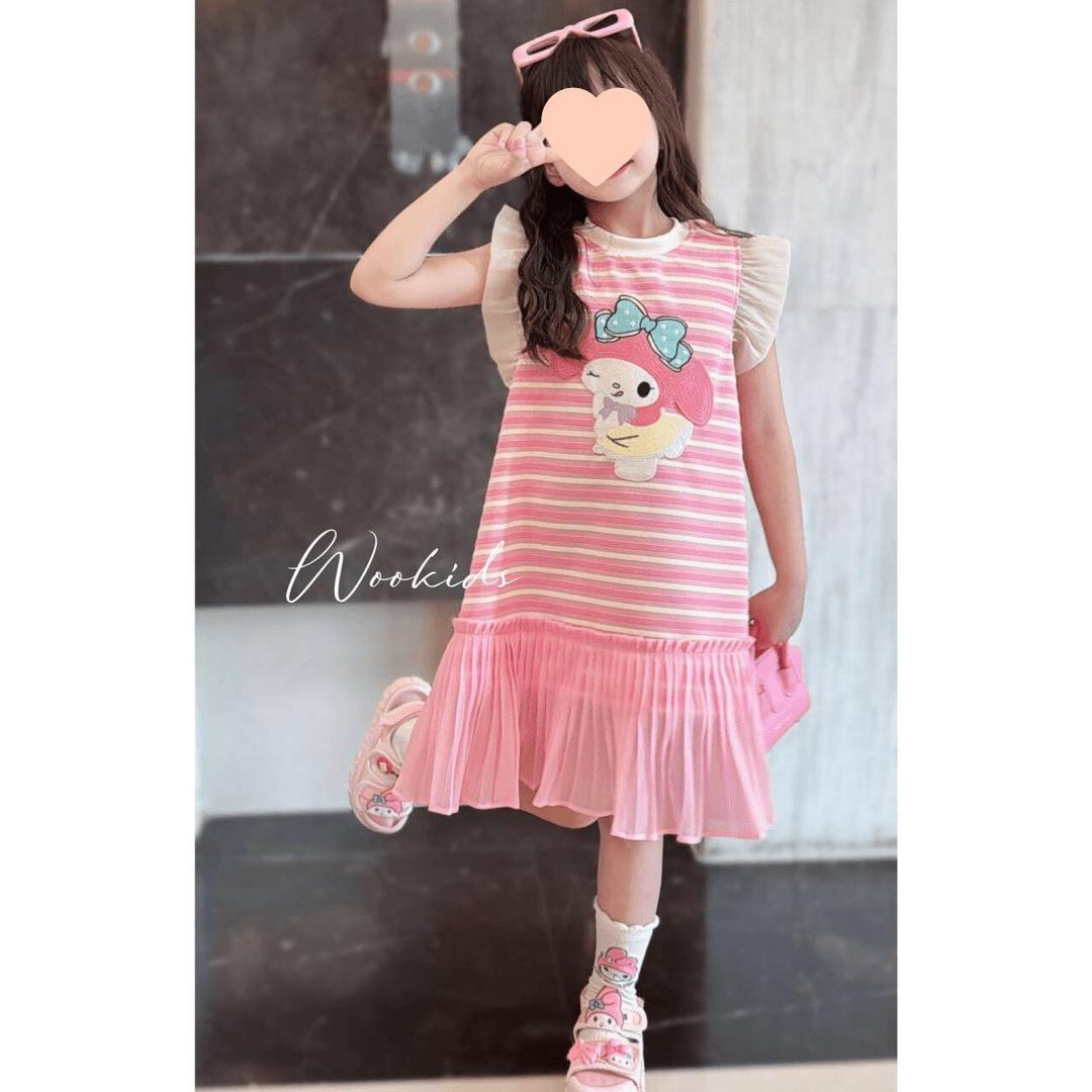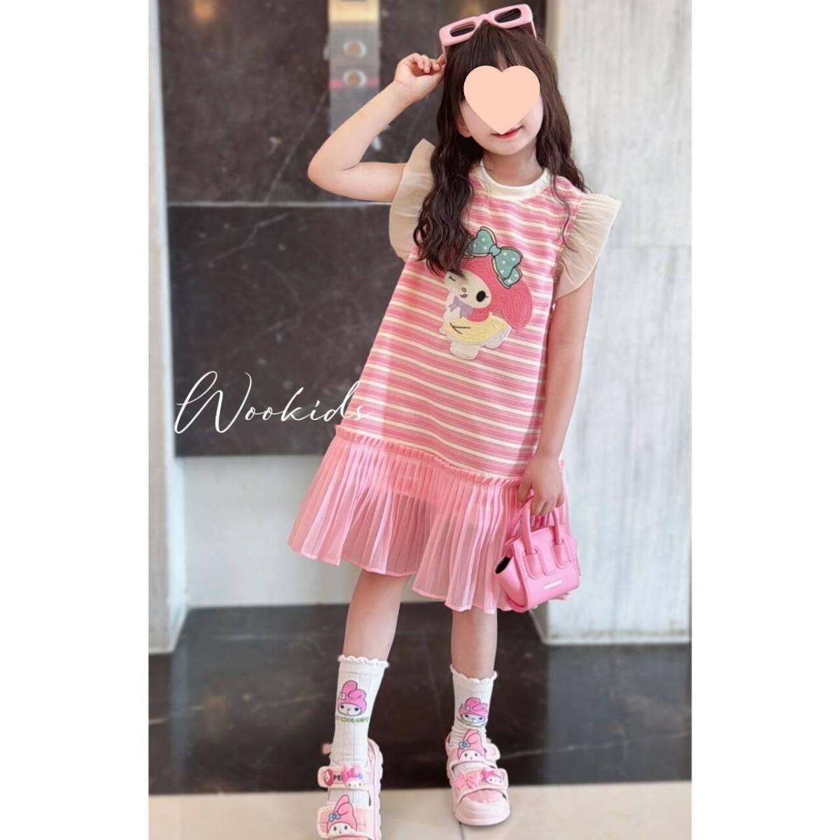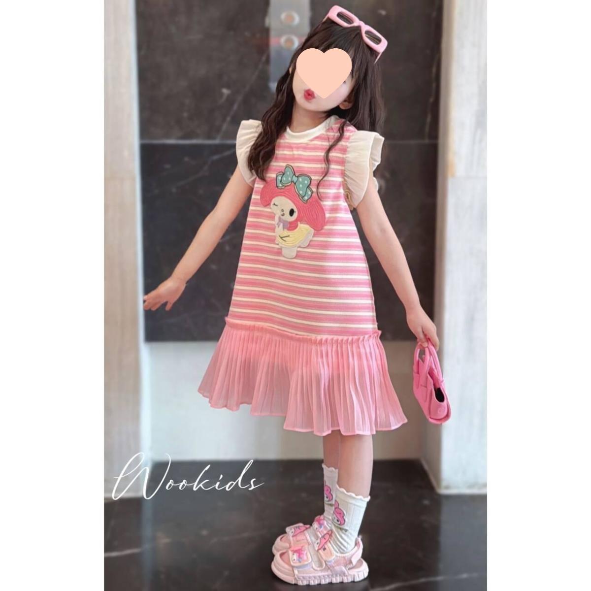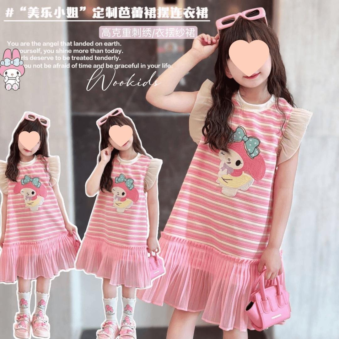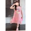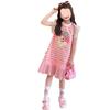 Vestido de verano con mangas voladoras para niñas, vestido de princesa informal de manga corta con estampado de dibujos animados y rayas de colores sólidos para niños grandes
