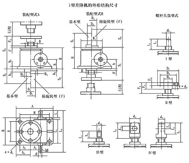 La estructura del husillo del elevador tipo 1: tipo básico (sin protección), tipo antirrotación (F), con cubierta protectora (Z), antirrotación con cubierta protectora (FZ)