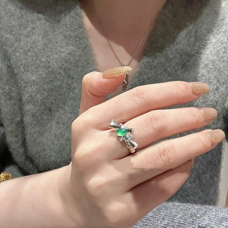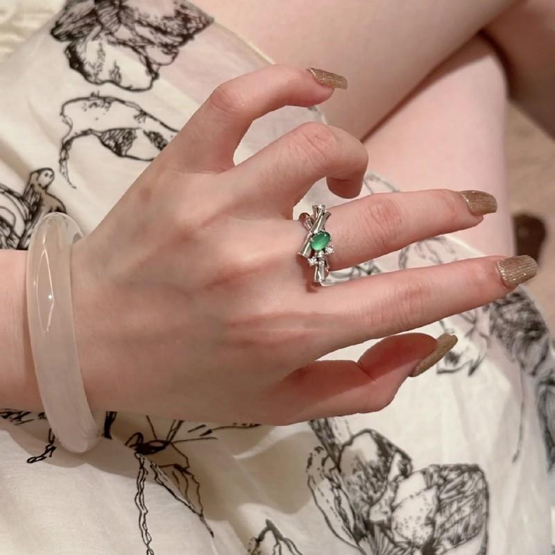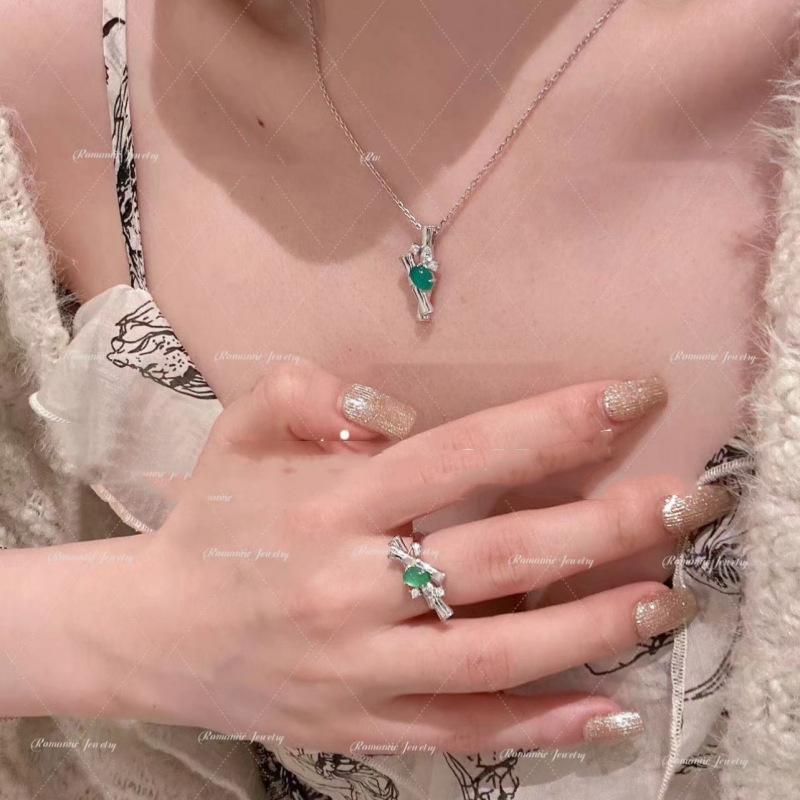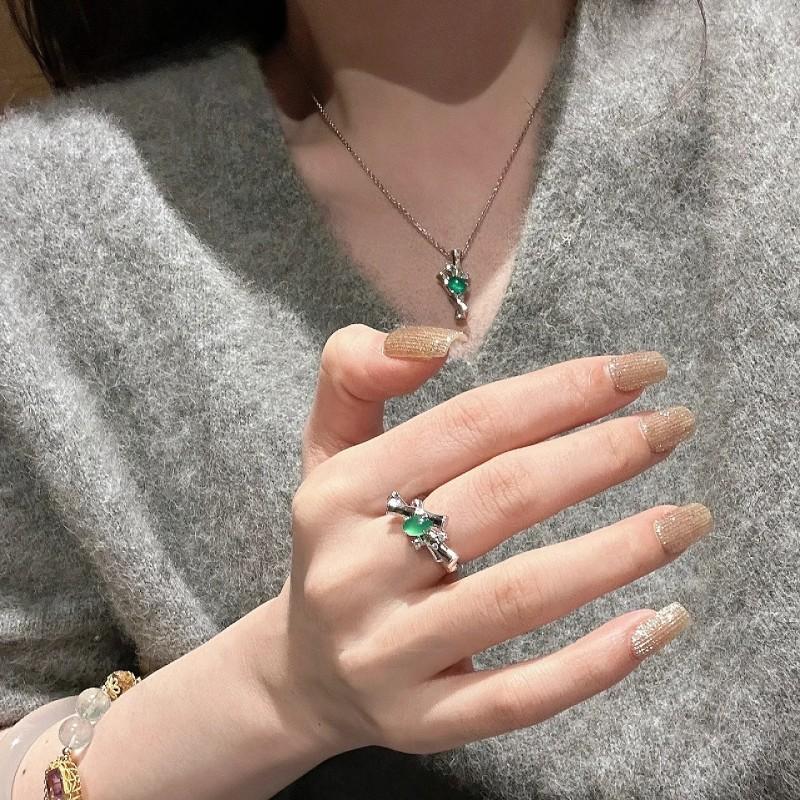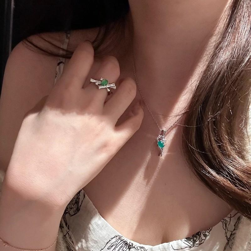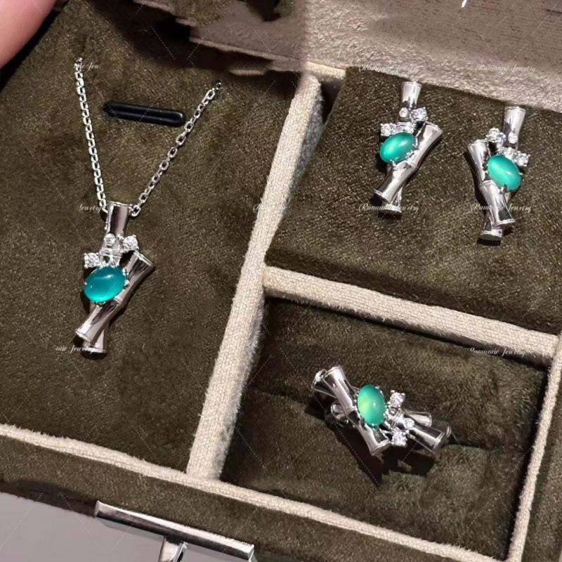 Nuevo Collar de Calcedonia Natural de Estilo Chino de Tiro Alto con Bambú Unilateral Anillo Abierto Aguja de Plata 925 Aretes Combinables