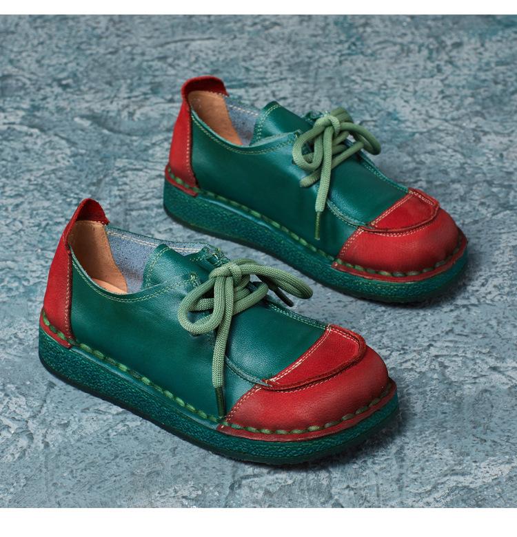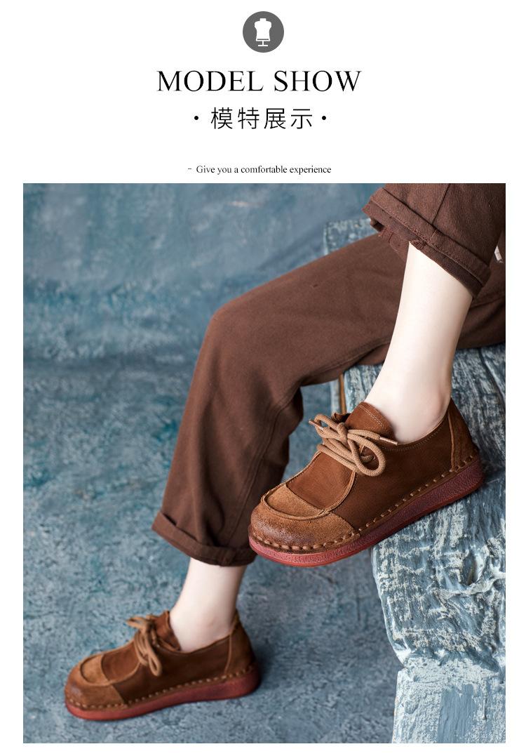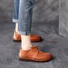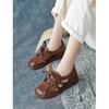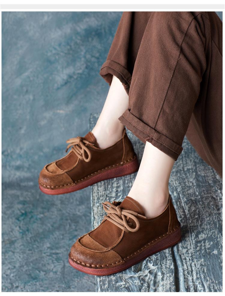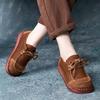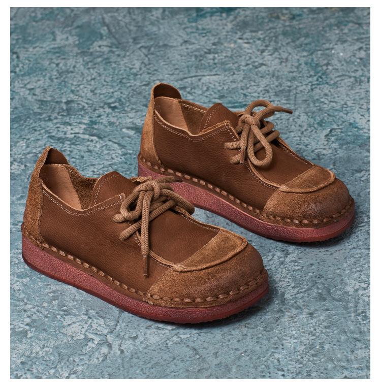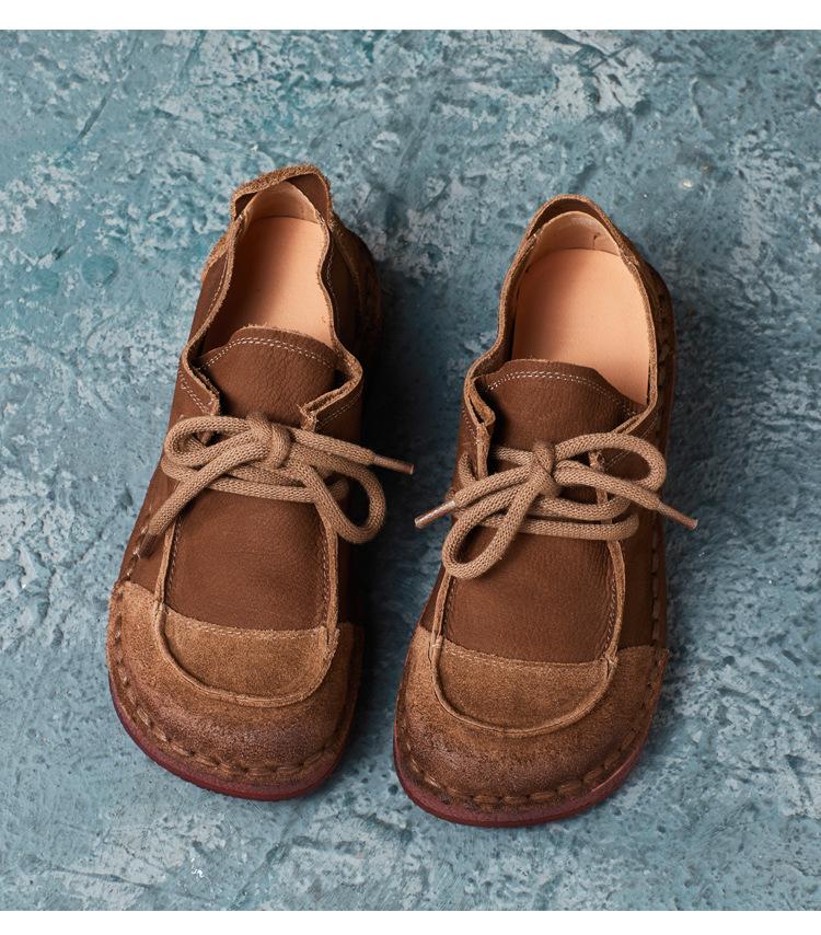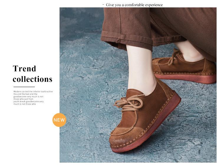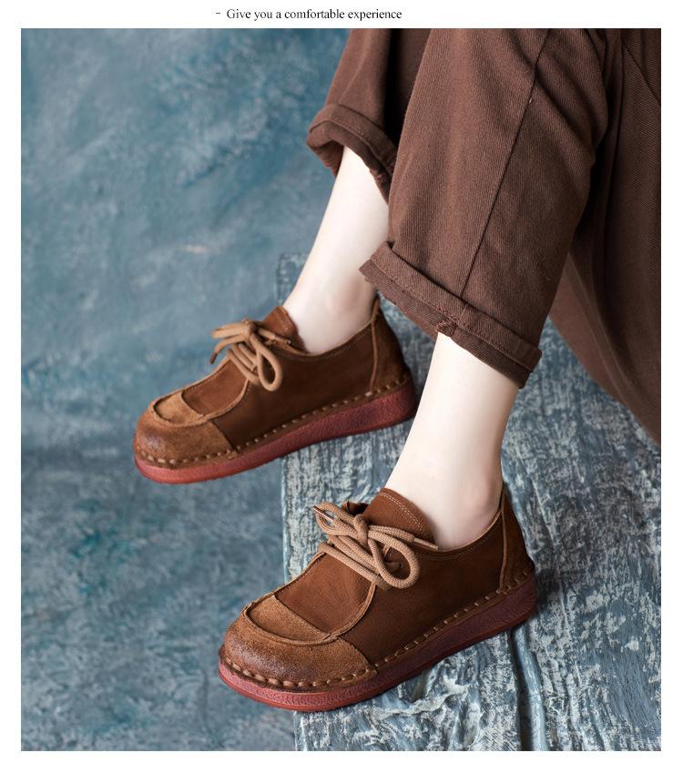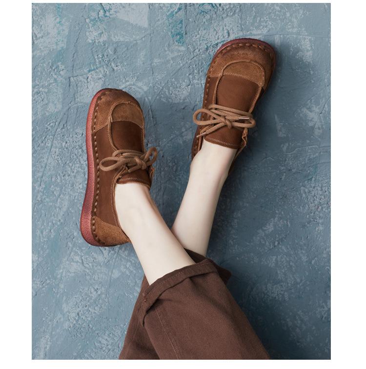 2025 Otoño Nuevo Estilo Étnico Retro Piel de Vaca Punta Redonda Zapatos de Mujer con Cordones Casuales de Tacón Bajo Plano Zapatos de Suela Blanda