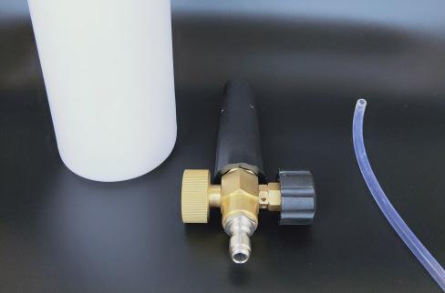 Principio básico:El flujo de agua a alta presión de la pistola rociadora de alta presión se mezcla con el detergente aspirado de la botella de solución jabonosa, y luego se agita minuciosamente mediante una pantalla de filtro de compresión especialmente diseñada, permitiendo que el detergente se disuelva en el flujo de agua a alta presión, produciendo espuma que es tanto uniforme como delicada cuando se rocía.