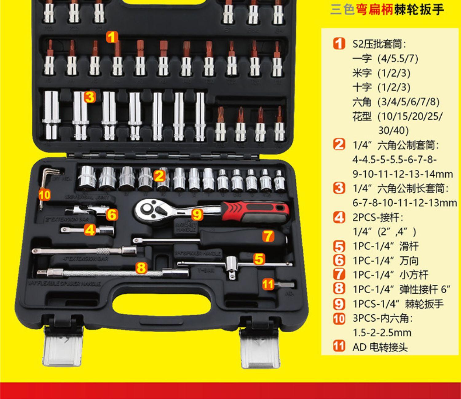 53-piece set of 24 teeth straight handle socket set, 53-piece set of 72-tooth curved handle socket set, 53-pie...