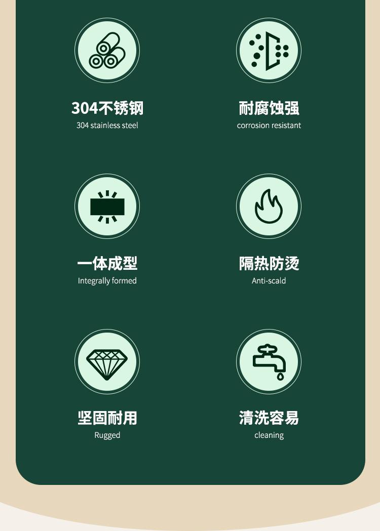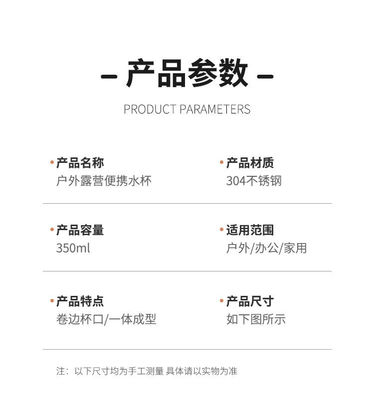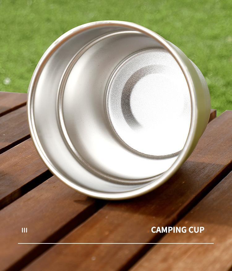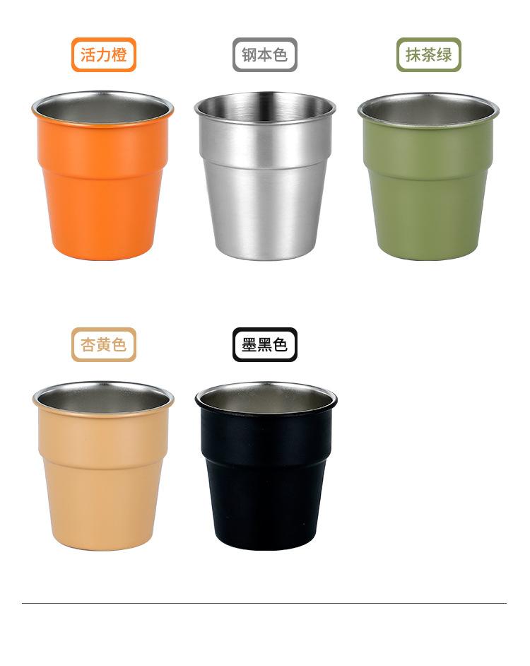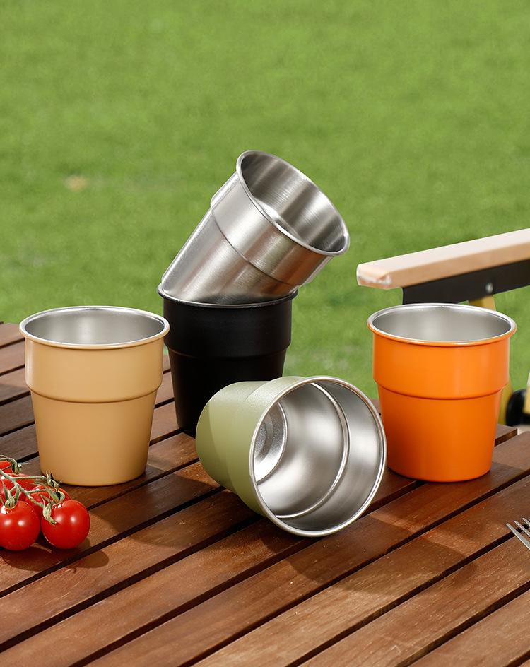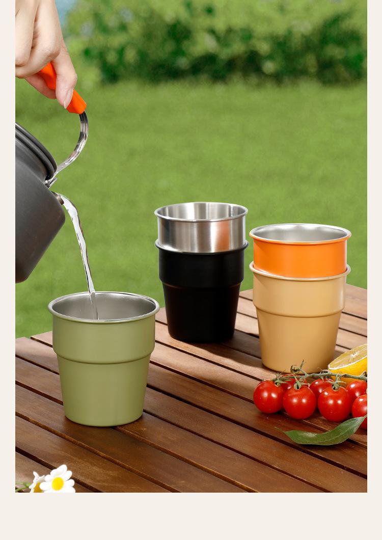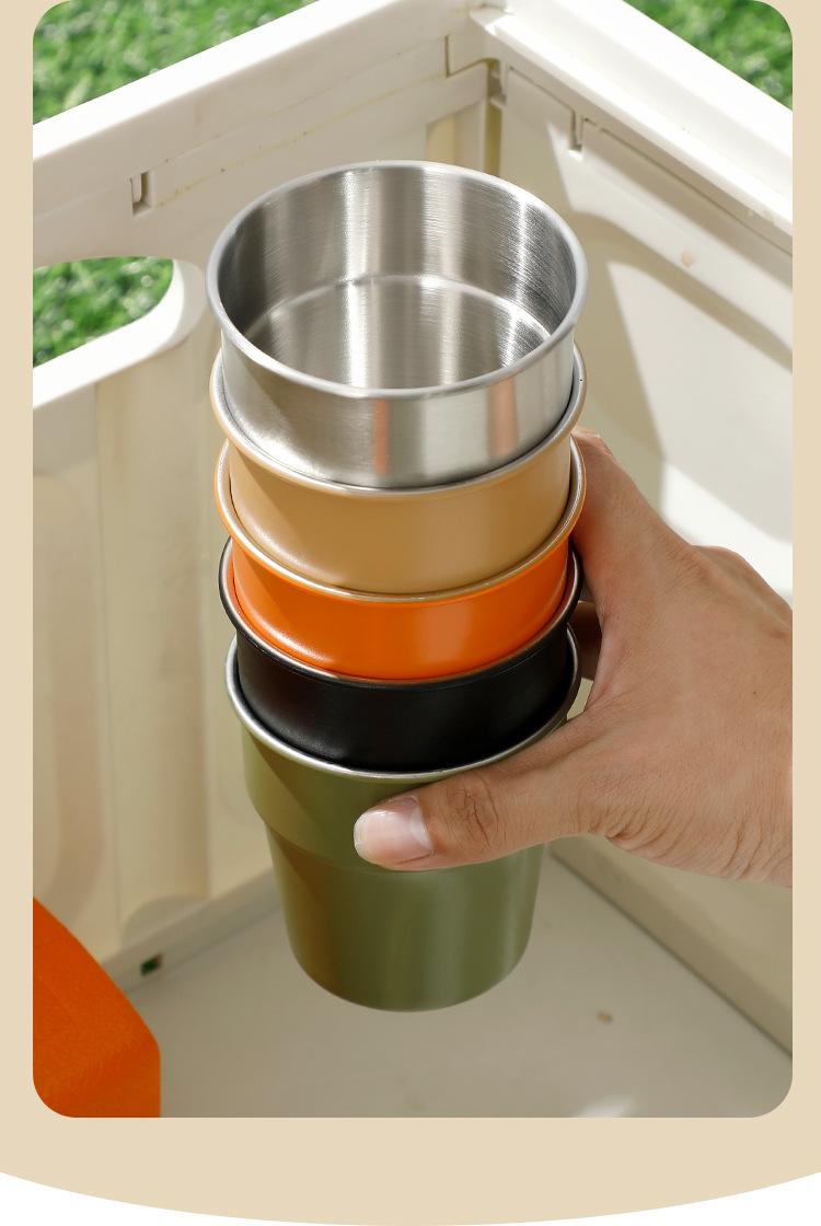 El vaso para exteriores está hecho de acero inoxidable 304 estirado de una sola pieza. El diseño es simple y duradero. El vaso está diseñado en forma escalonada y se puede apilar y almacenar para facilitar su transporte.