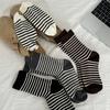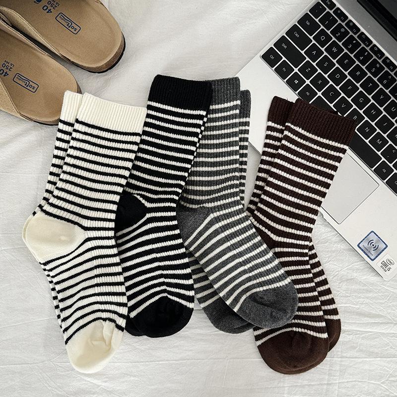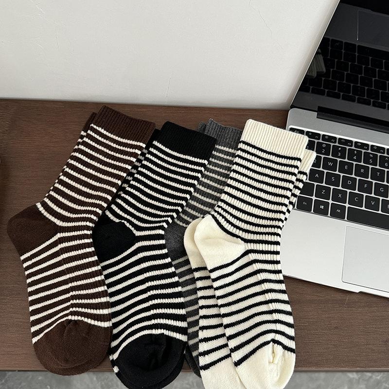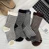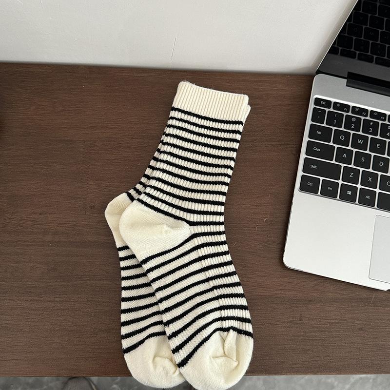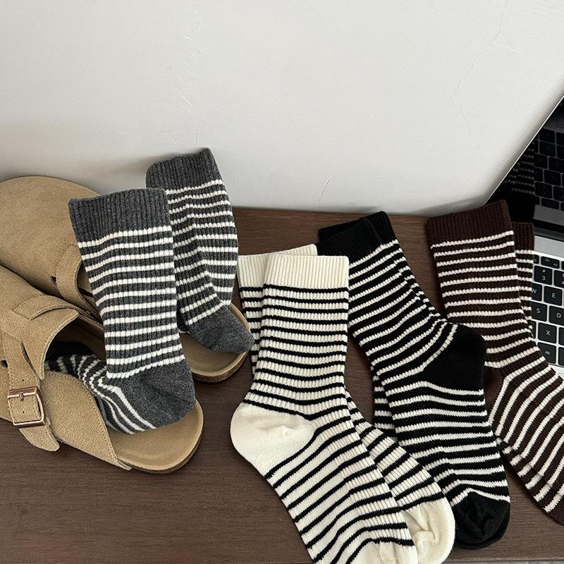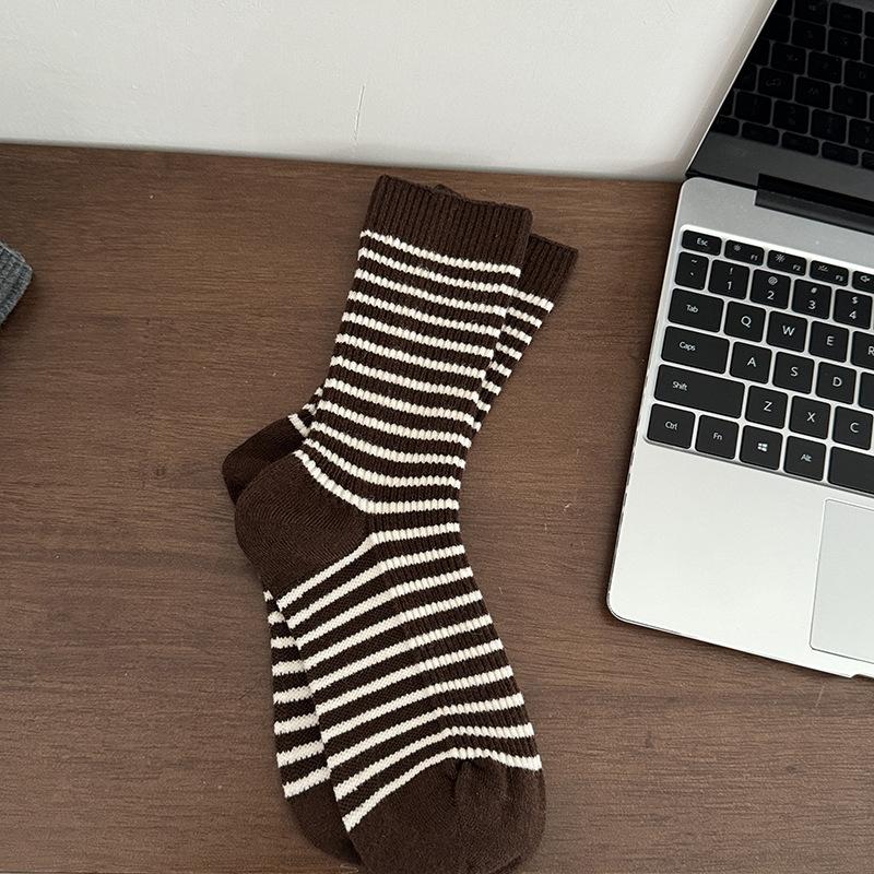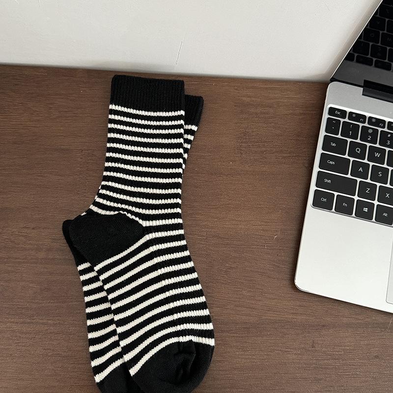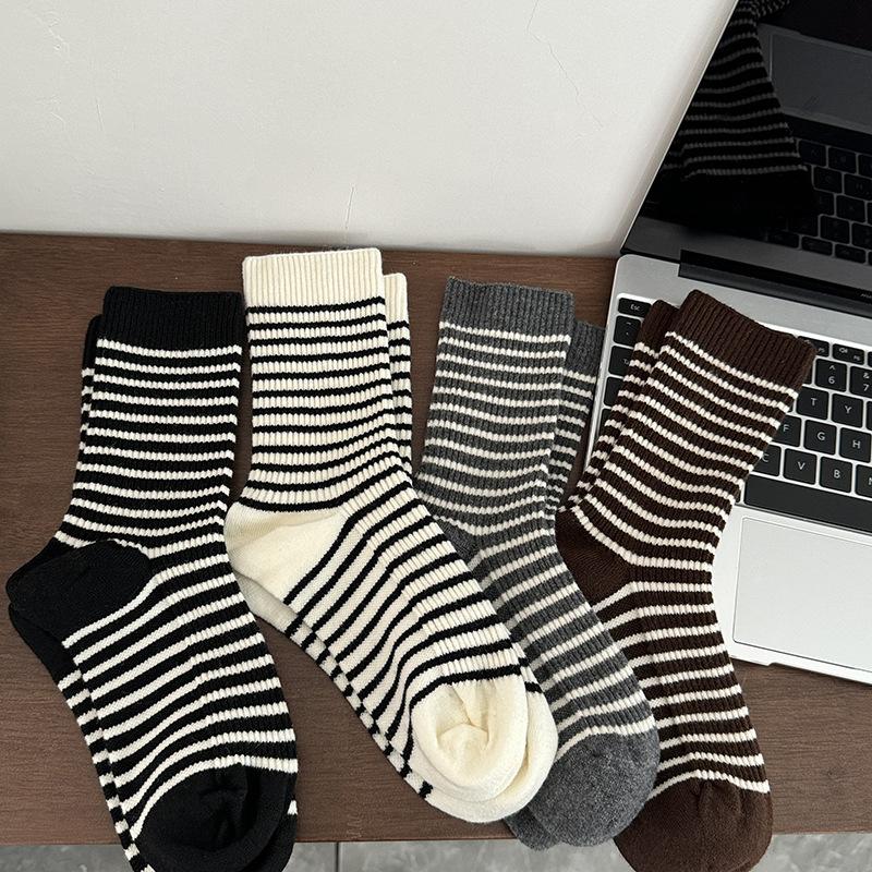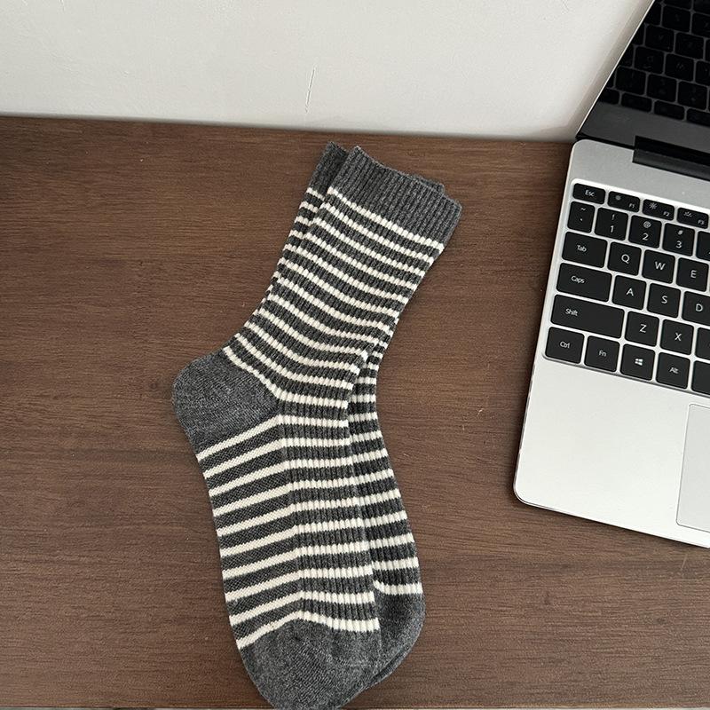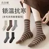 Calcetines de cachemira a rayas para mujer, calcetines hasta media pantorrilla, otoño e invierno, medias gruesas de lana negra cálida, calcetines Zhuji