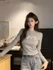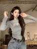 Camiseta retro americana de manga larga con hombros descubiertos para mujer, nueva camiseta de otoño con letras bordadas, ajustada, básica, top corto para chica atractiva