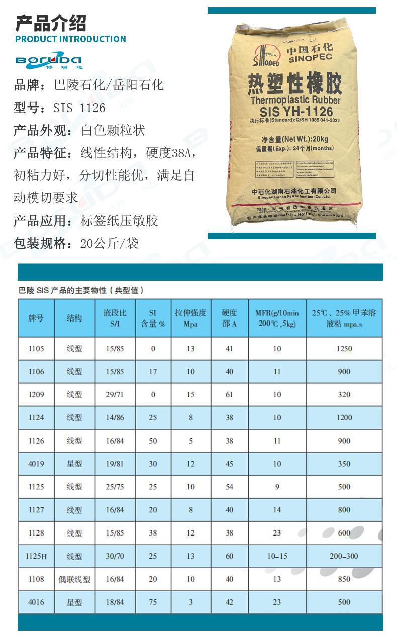 (1) Baling Petrochemical YH-1126 es un copolímero lineal estireno-isopreno-estireno SIS con un contenido de estireno de 16 y una apariencia de partículas blancas. Es adecuado para la preparación de adhesivo sensible a la presión para papel de etiquetas, tiene buena adhesión inicial y buen rendimiento de corte, y cumple con los requisitos de troquelado automático.